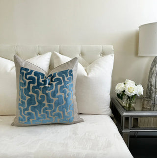Framed Mediterranean Blue Velvet and Beige Linen Throw Pillow