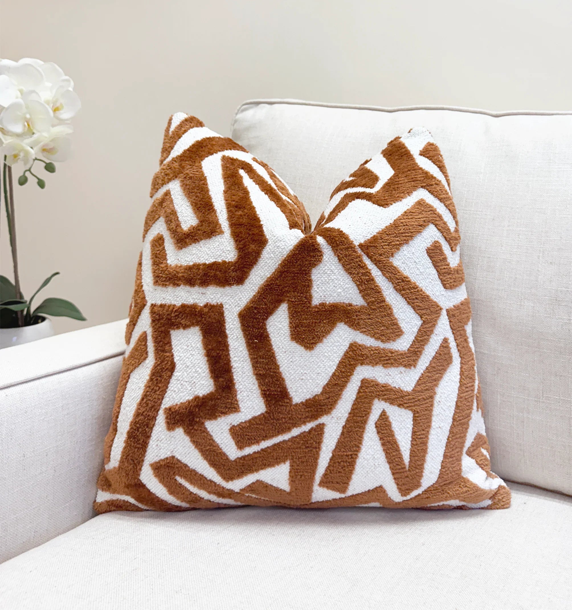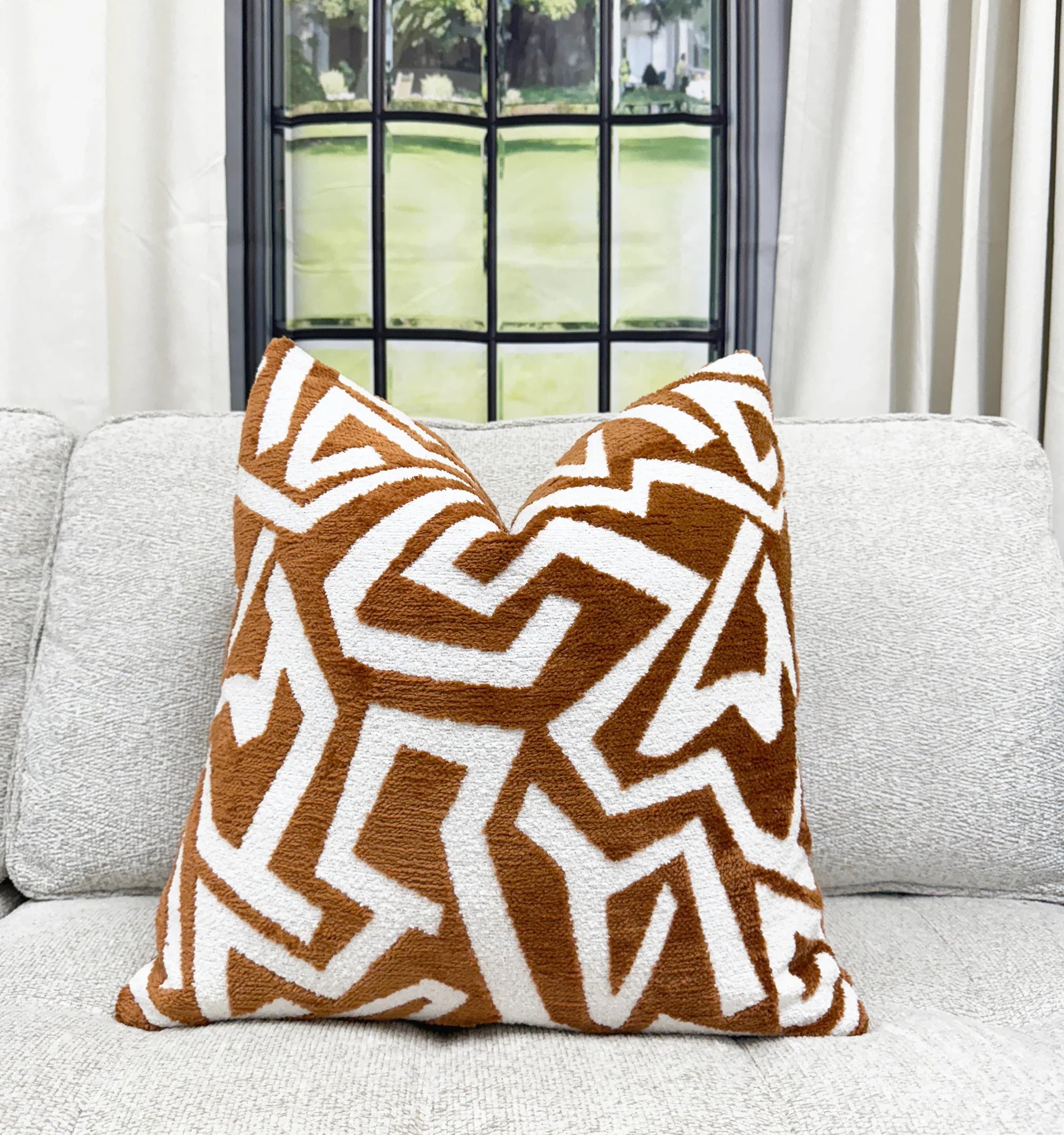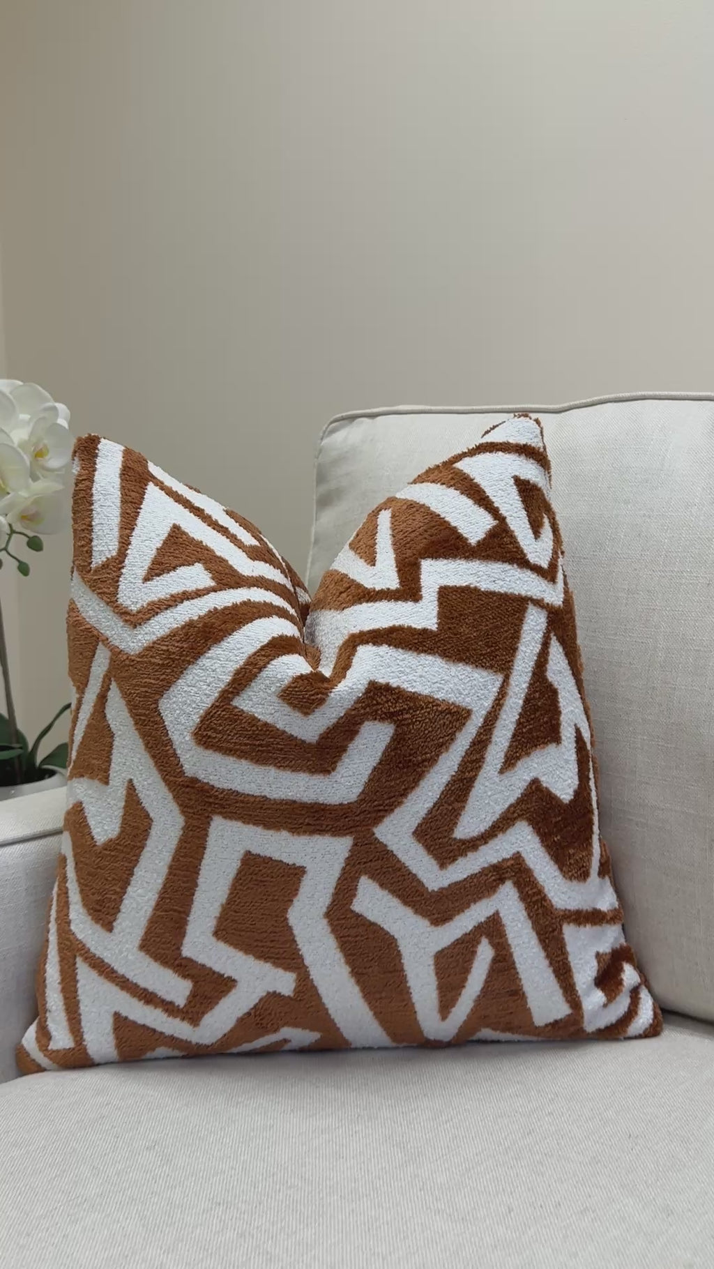 This pillow blends warm caramel velvet with a soft bouclé backdrop, creating a bold, modern geometric look. The mix of textures adds depth and warmth, making it an easy statement piece for any space.