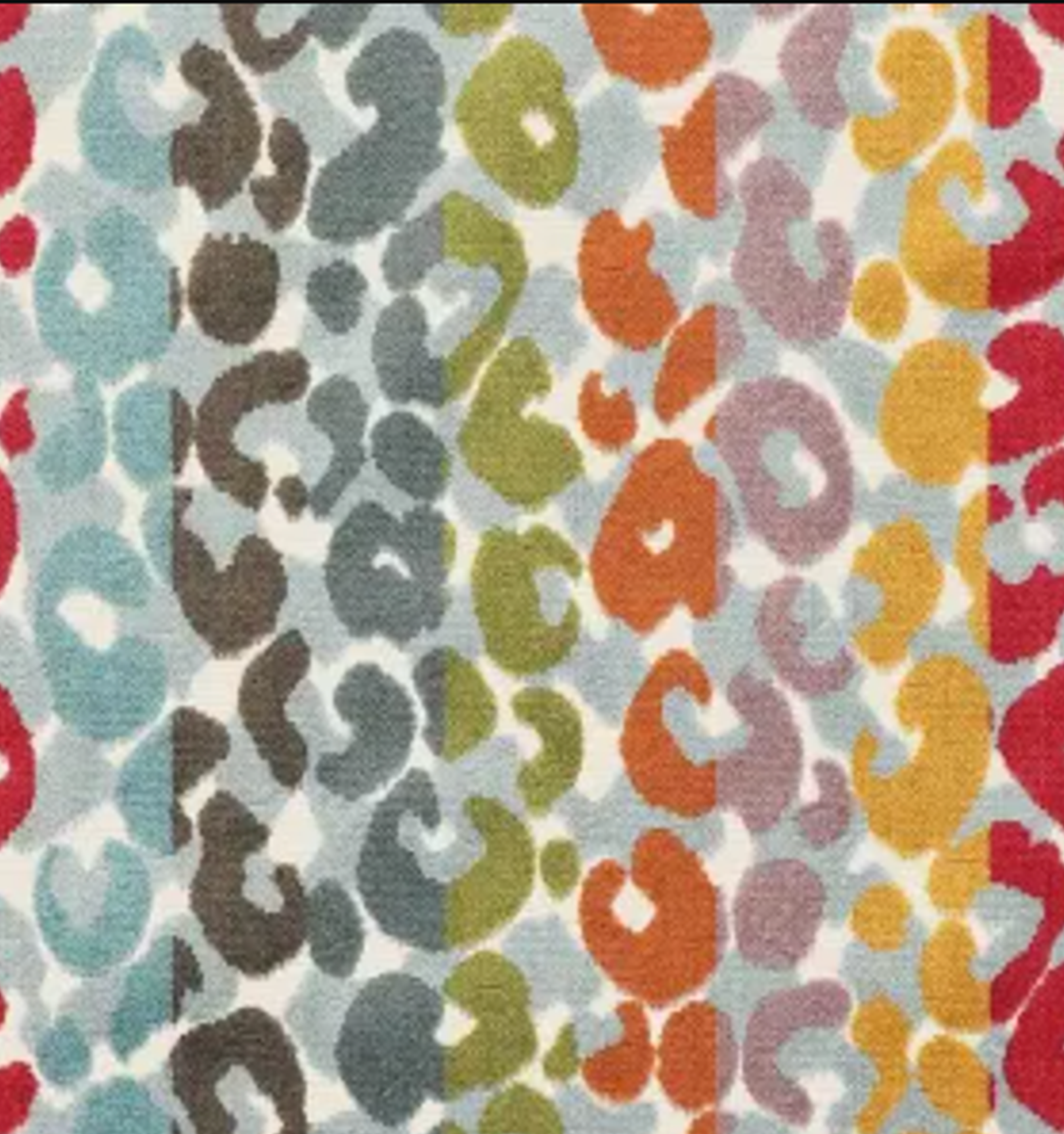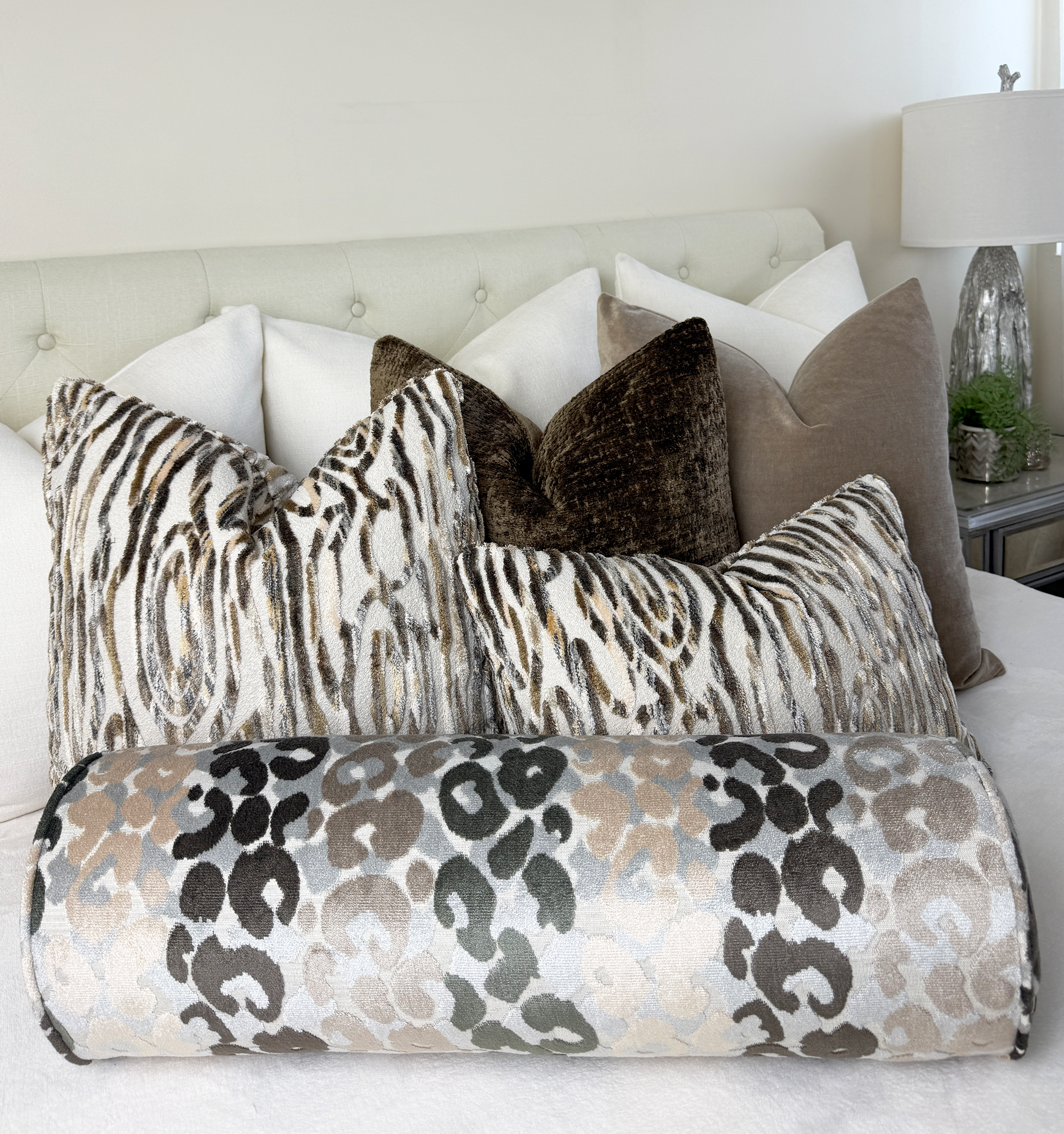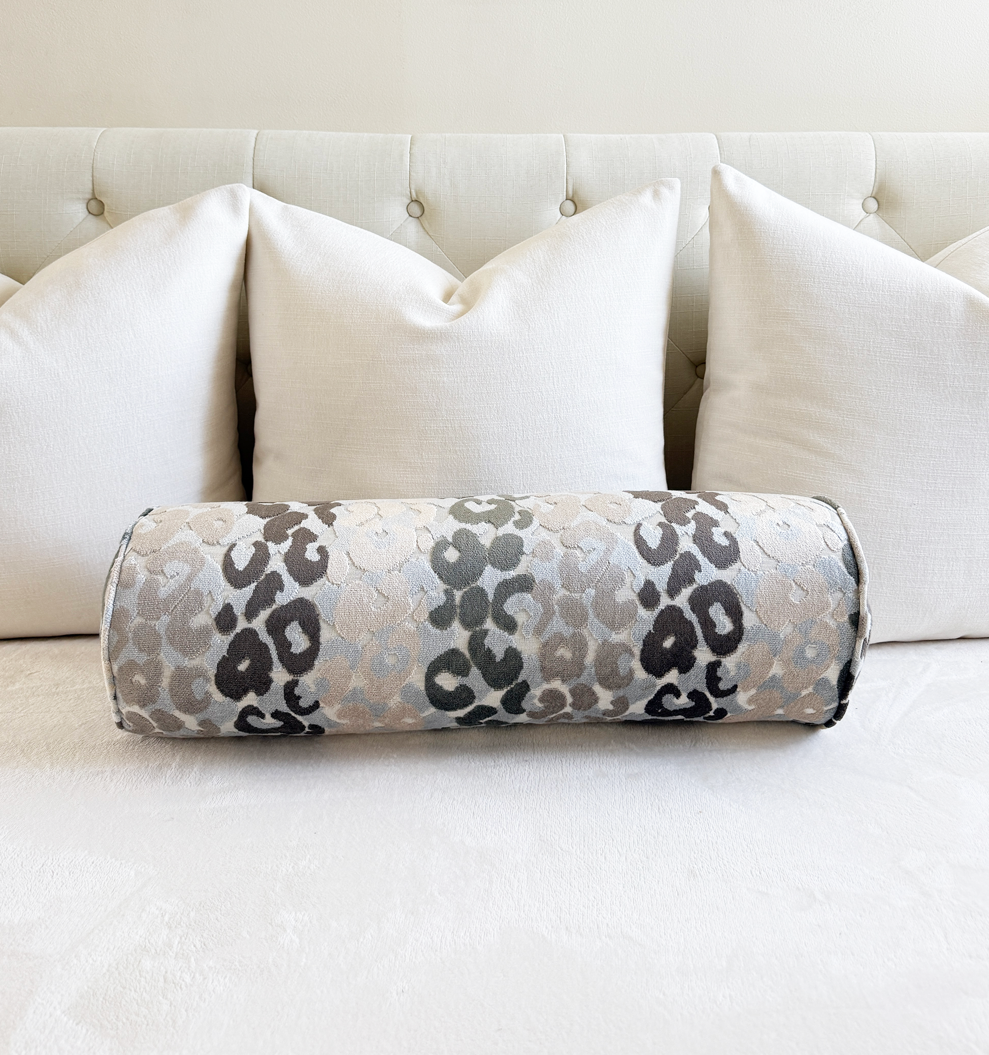 This bolster pillow features a modern leopard stripe pattern, blending soft, abstracted spots into a subtle striped layout that adds movement without feeling busy. The design feels graphic yet relaxed, offering visual interest that layers easily with solids and other patterns. The stony gray colorway keeps the look neutral and understated, while the bright multicolored version introduces a richer mix of muted blues, greens, rusts, and warm golden tones for a more expressive accent.