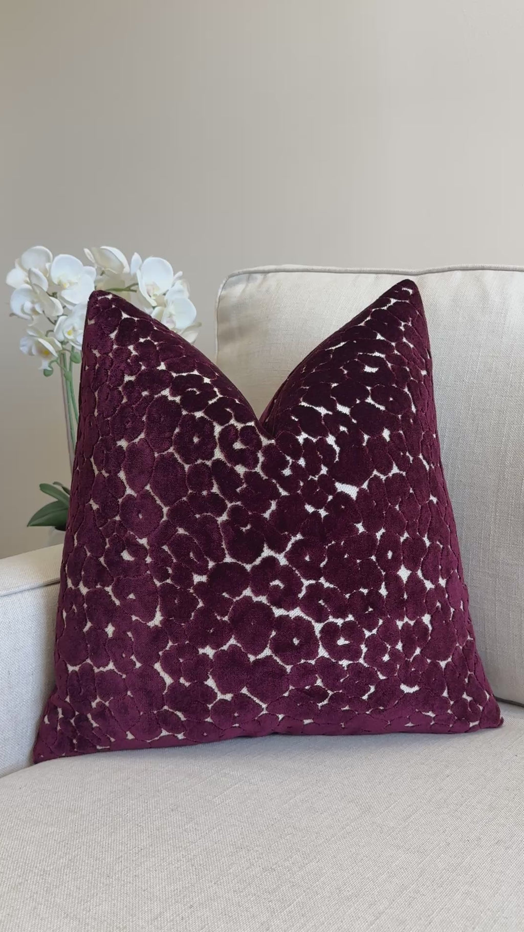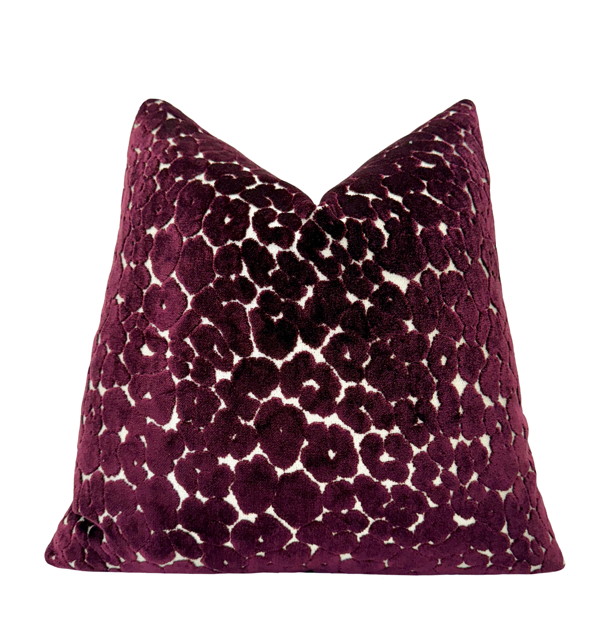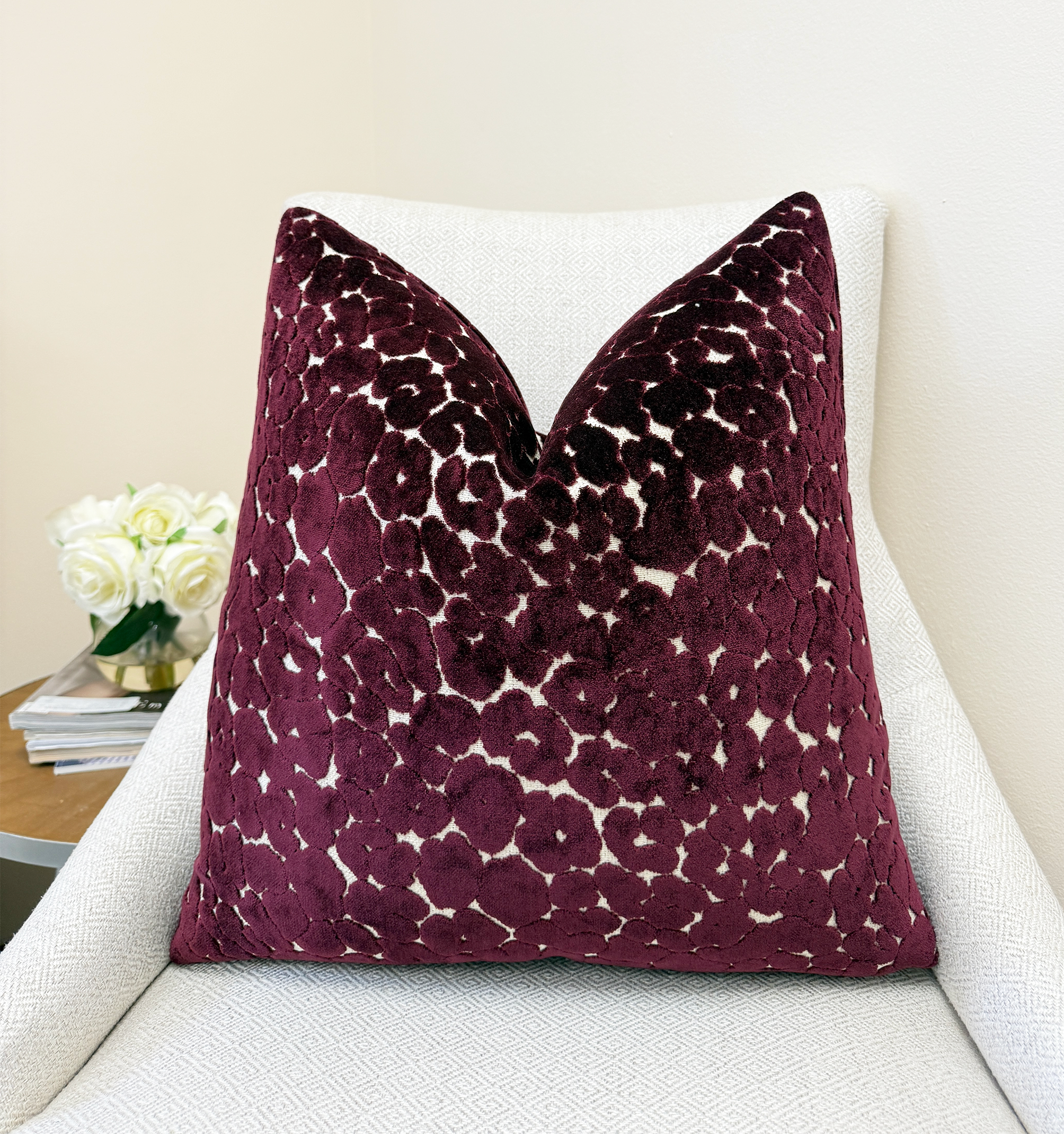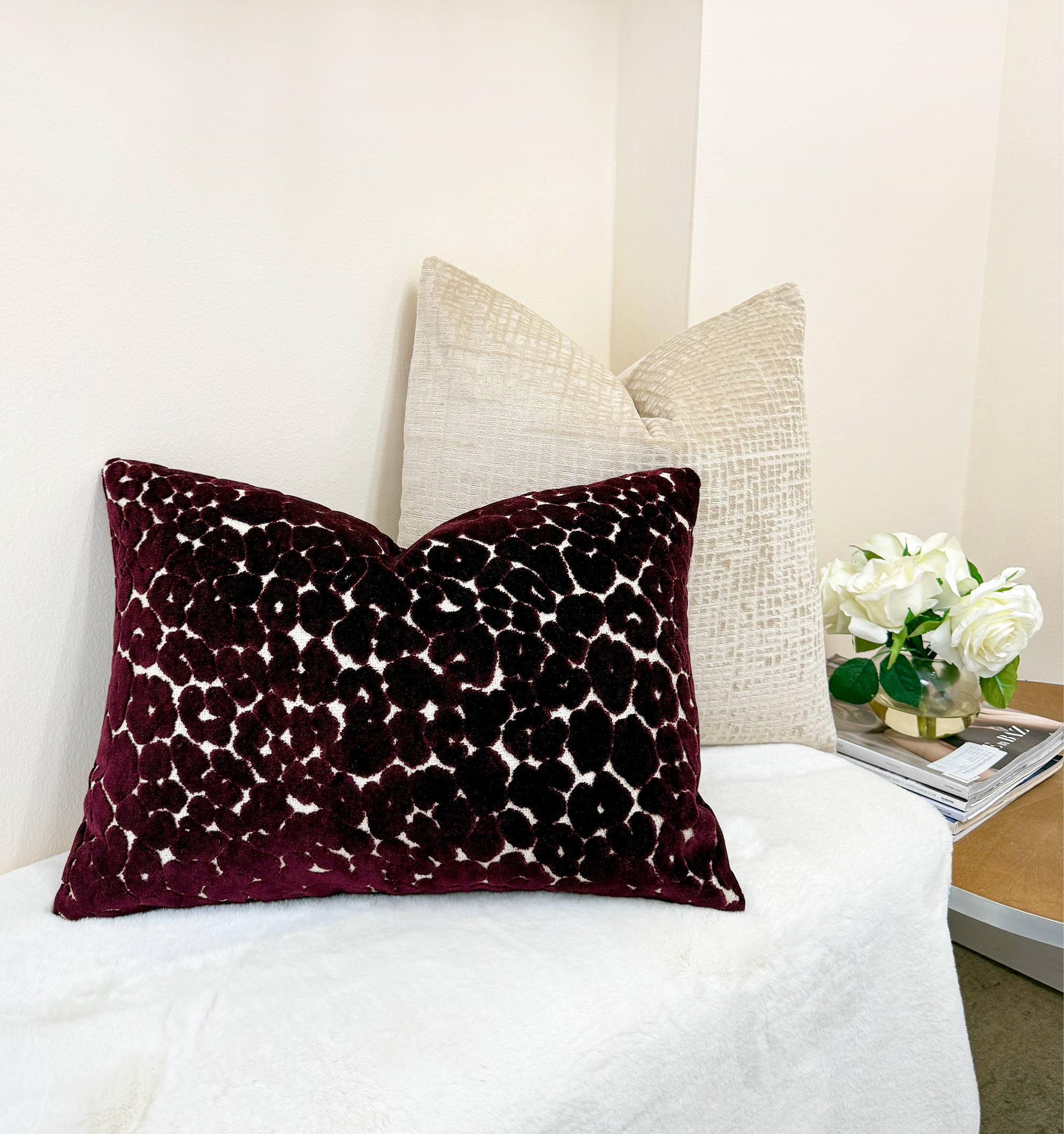 Rich and dimensional, the aubergine leopard pillow features a cut velvet design in deep plum tones over a soft neutral ground. The subtle sheen and textured pattern add depth and warmth while keeping an elegant, tailored feel.