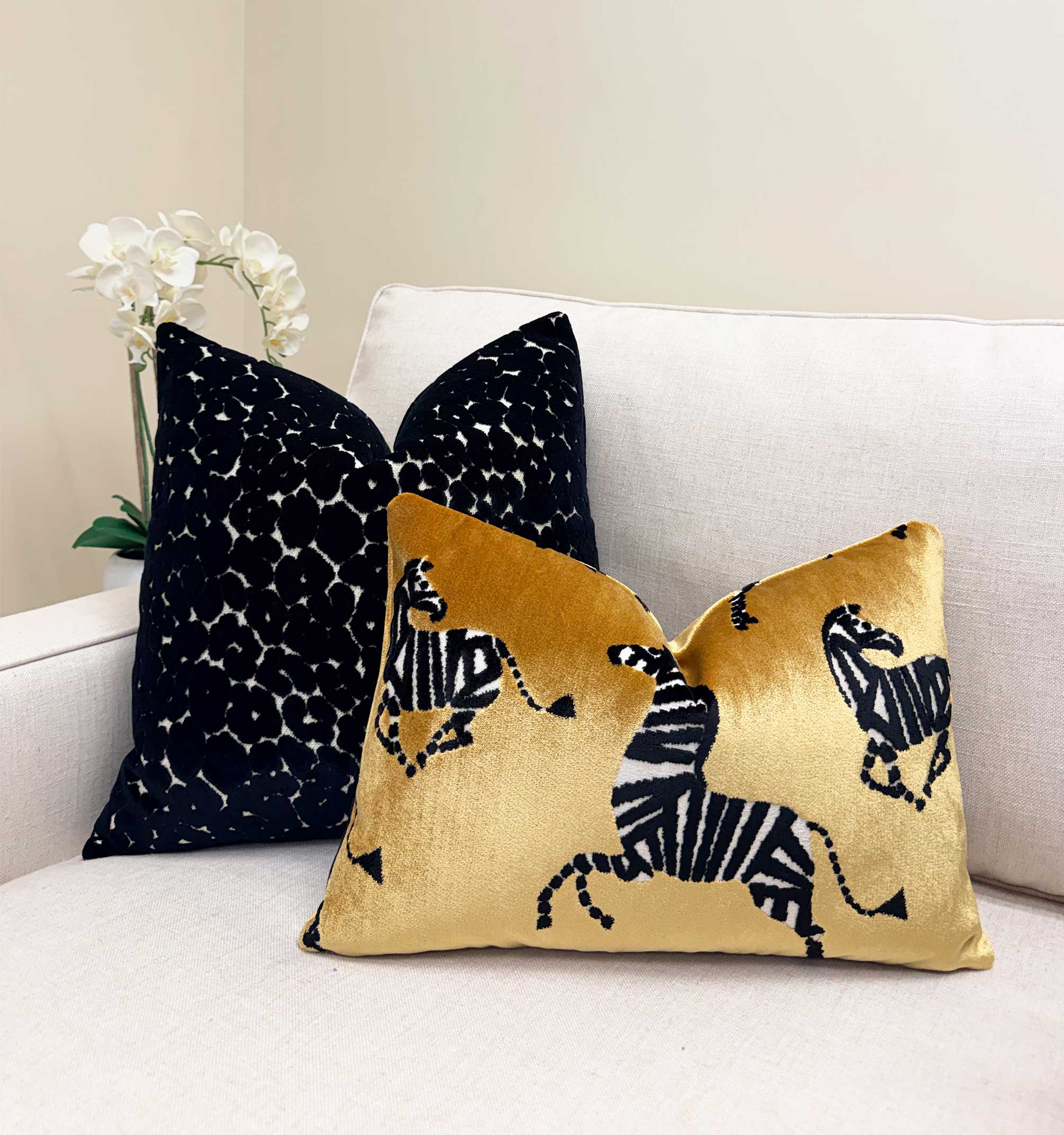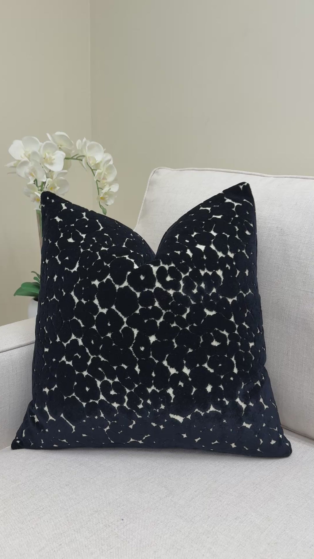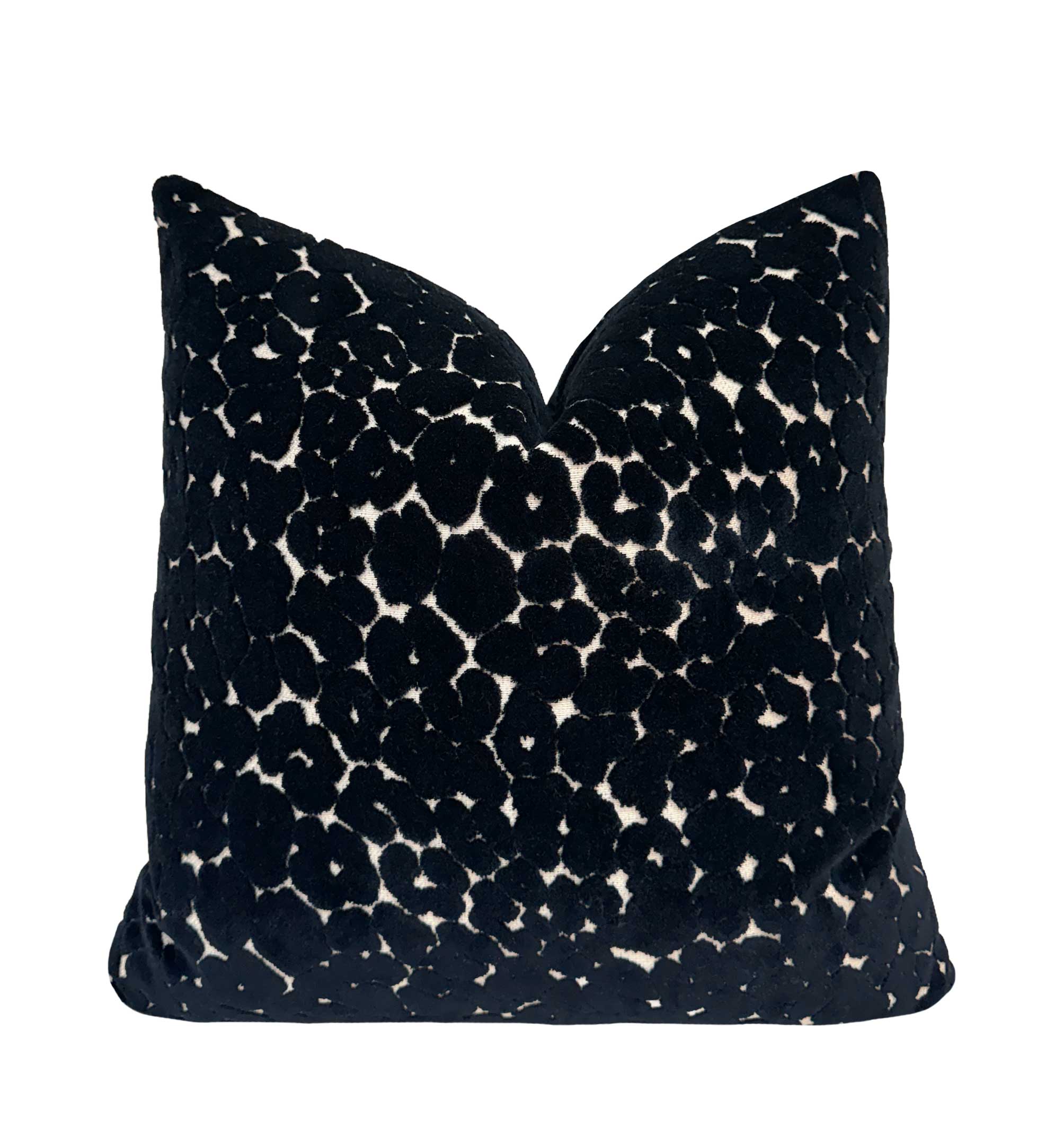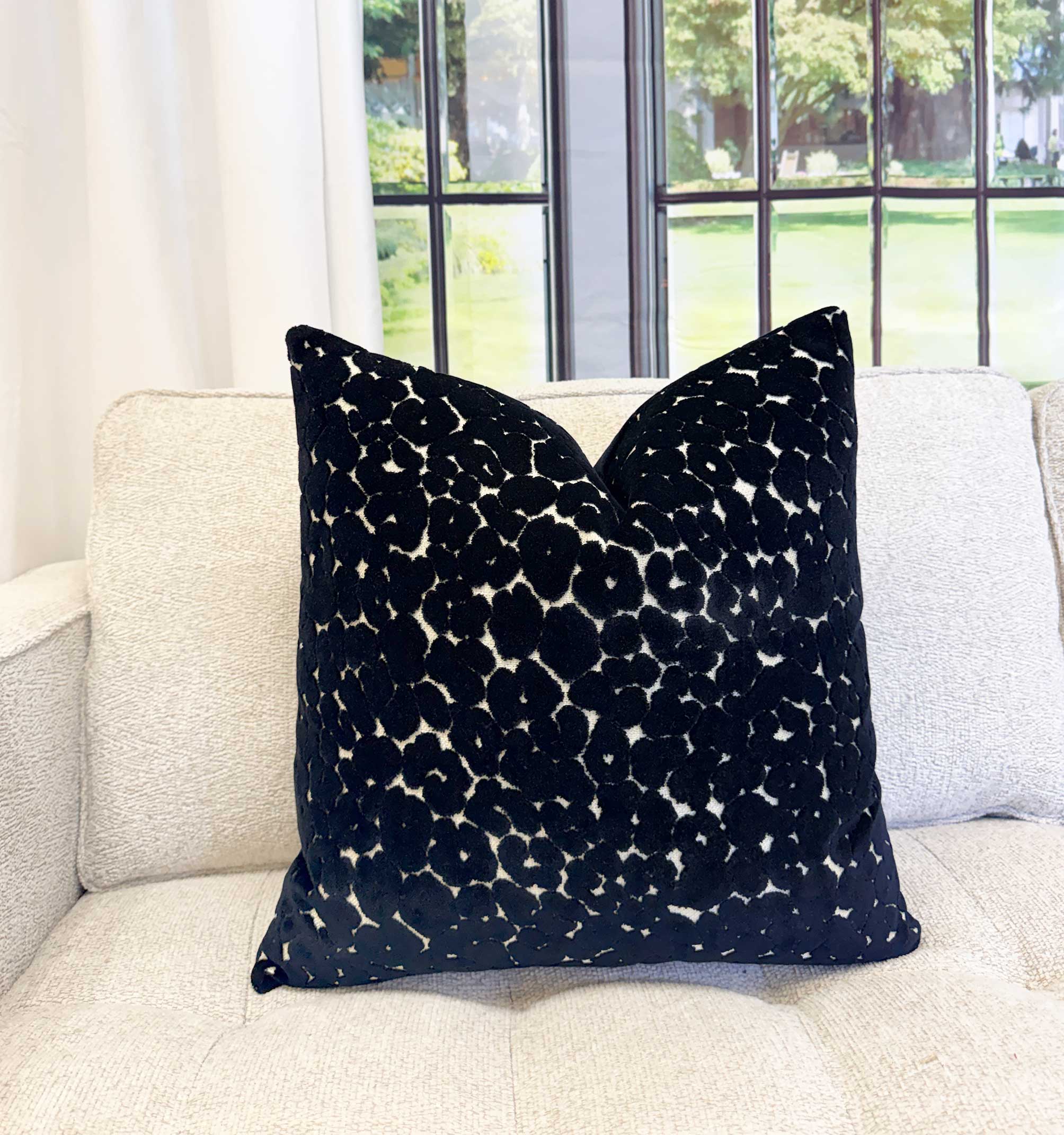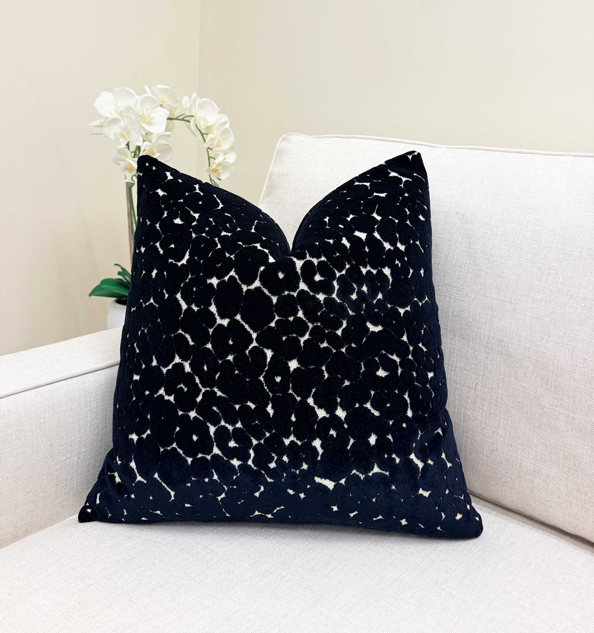 A deep black velvet pillow featuring an intricate cutwork-style pattern that reveals soft ivory beneath, creating a subtle, organic contrast. The design feels almost sculptural—rich in texture yet refined enough to blend seamlessly into both modern and classic spaces. It adds depth without overpowering, making it an easy anchor piece for a layered, high-end look.