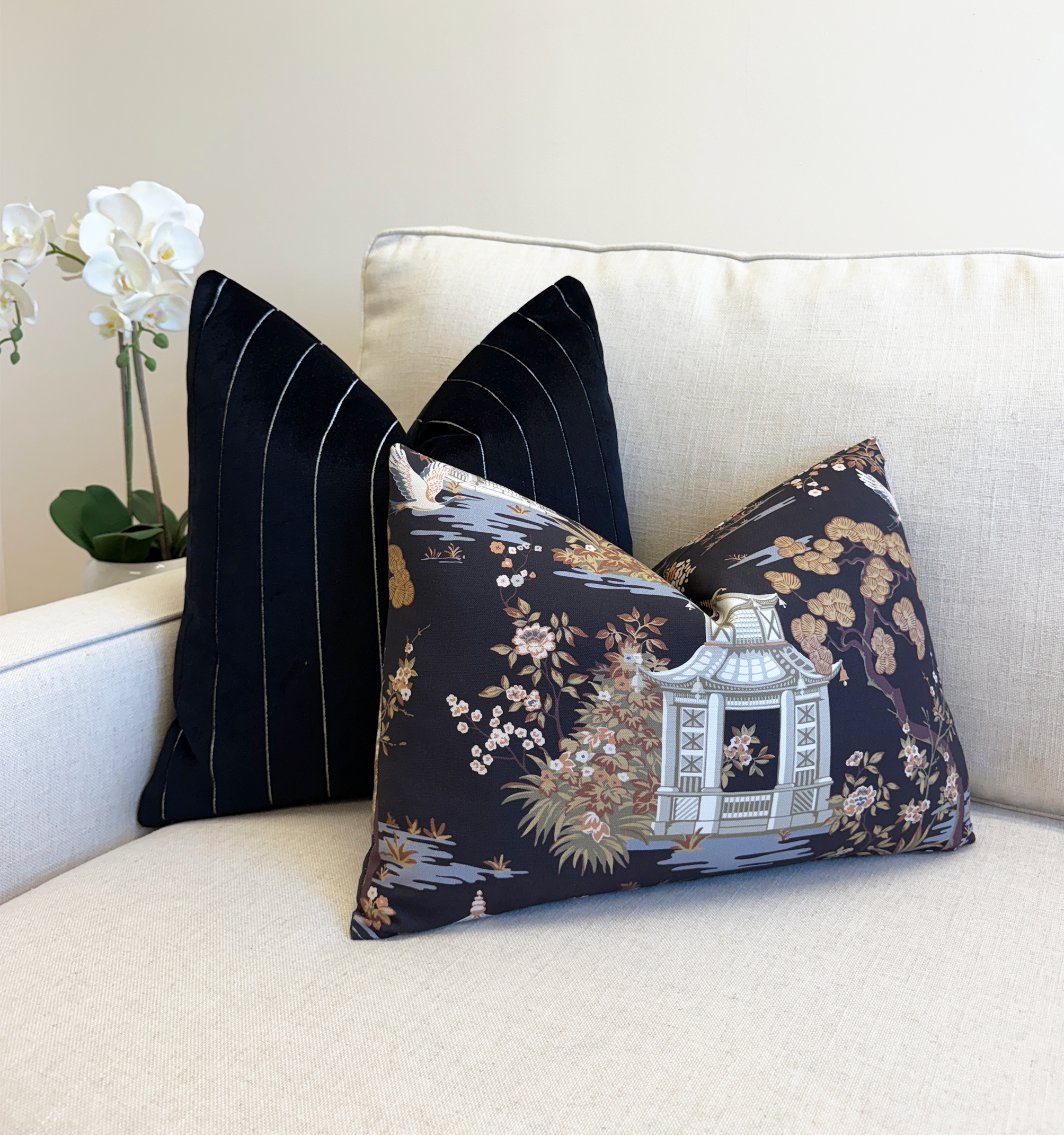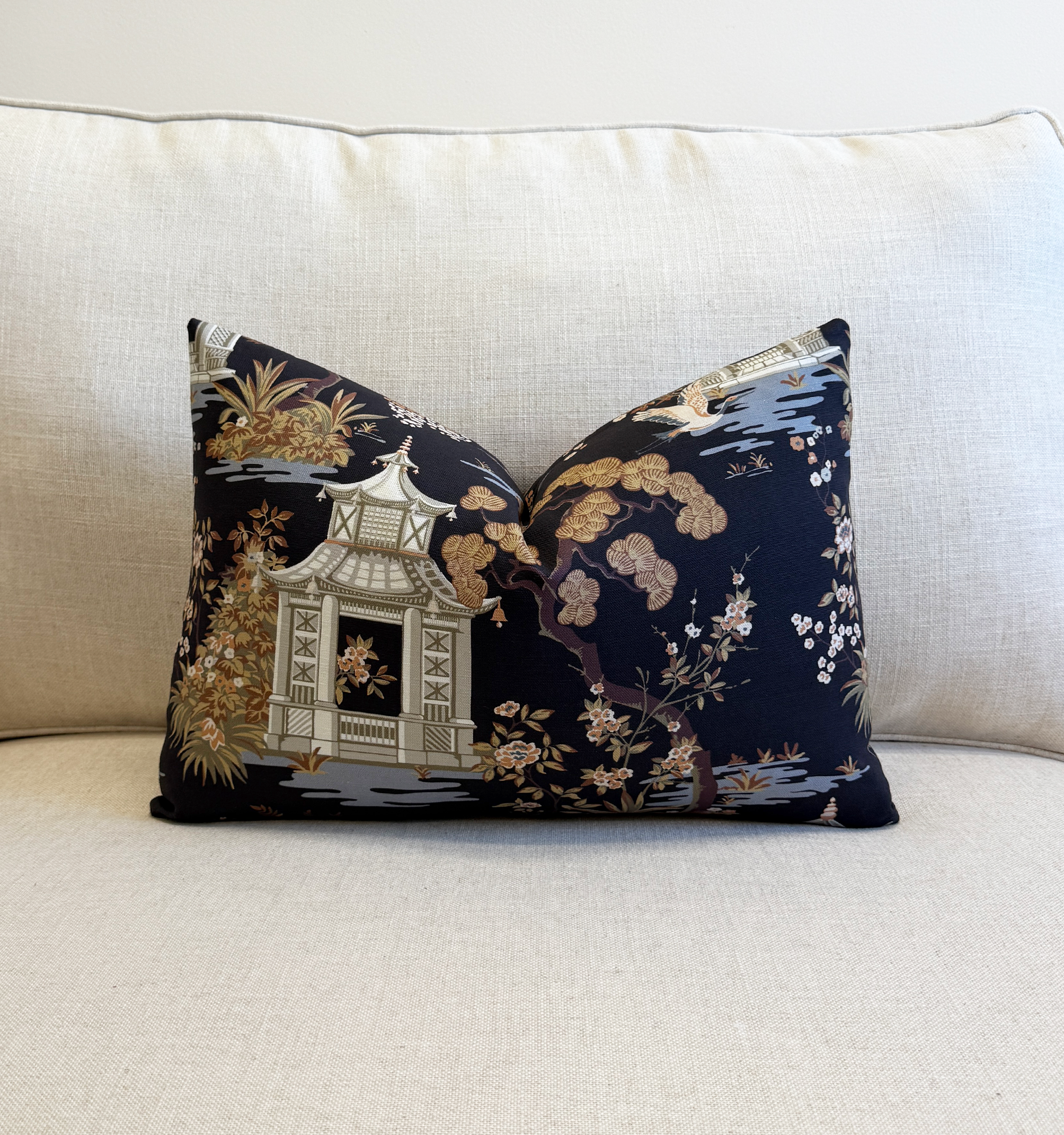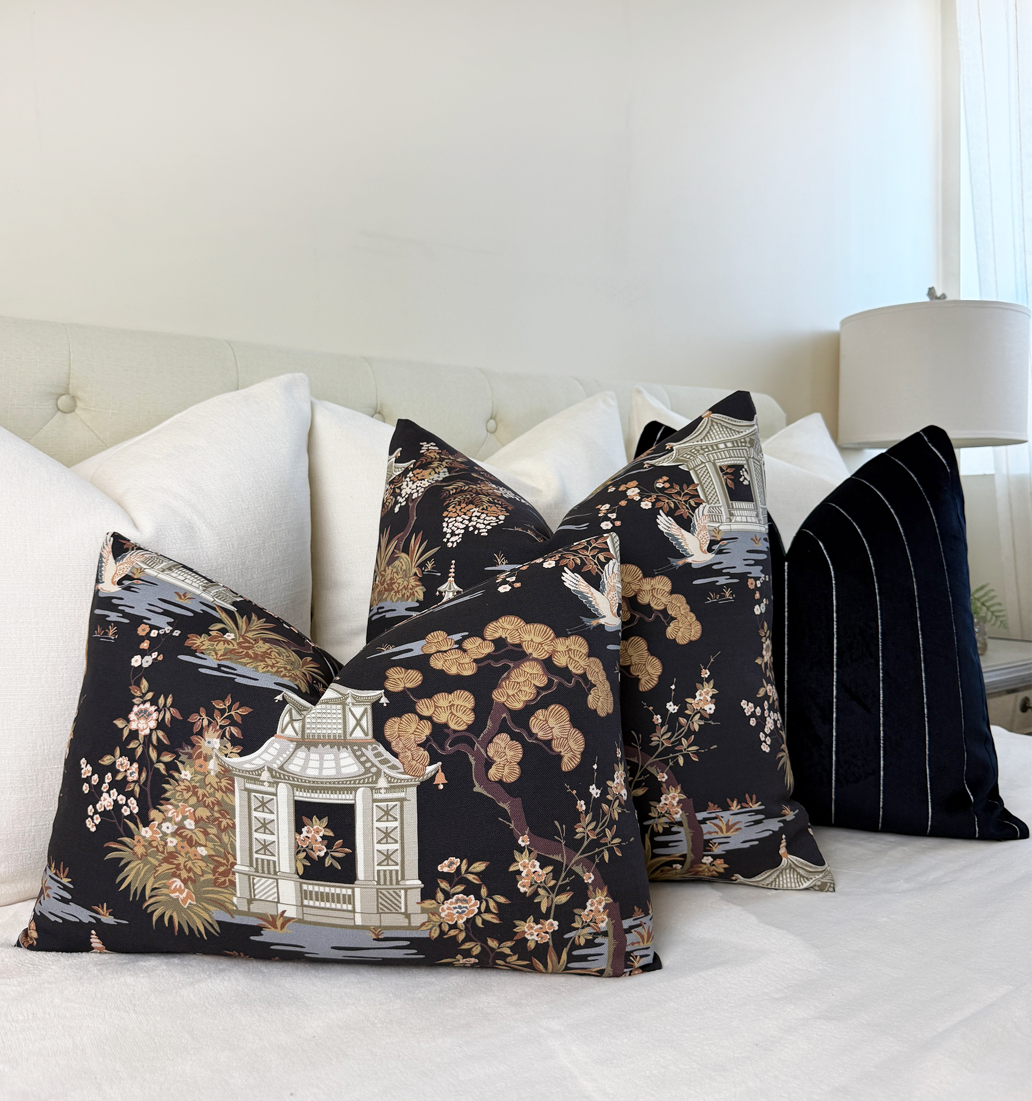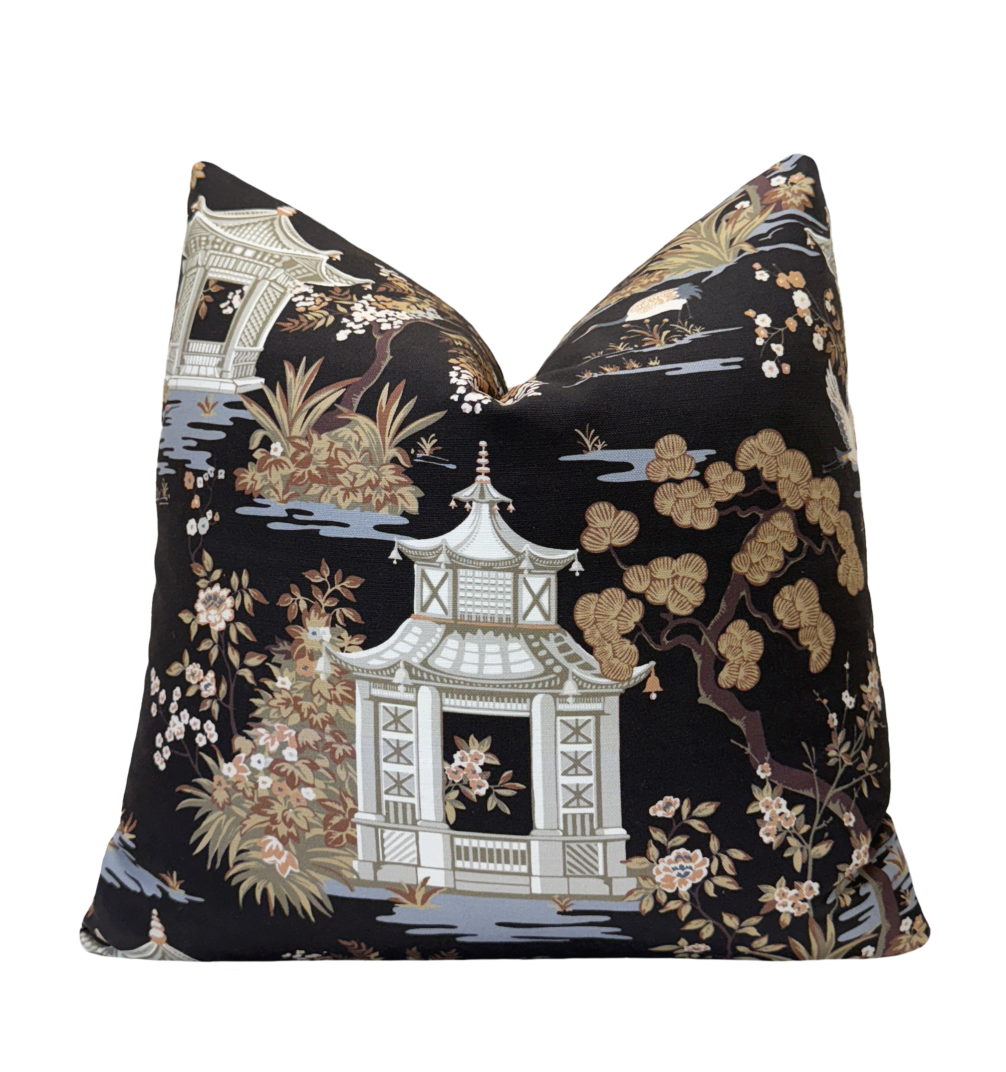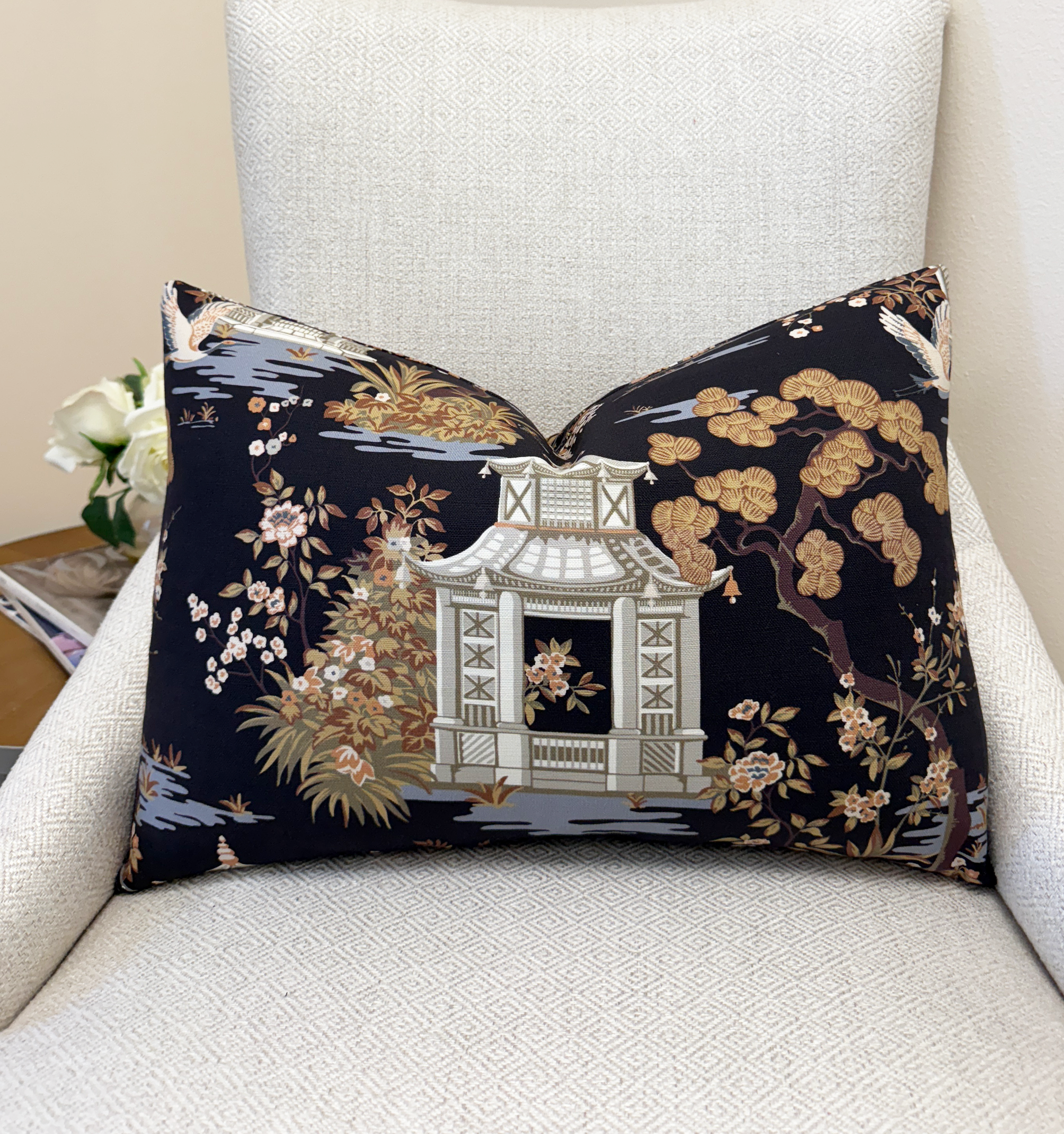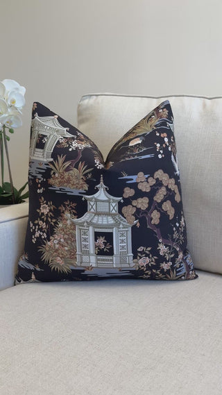 This black chinoiserie pillow features an elegant garden scene of pagodas, flowering trees, and serene water motifs in soft taupe, ivory, and muted gold. The rich contrast between the dark background and detailed print makes it a statement piece that feels both refined and timeless.