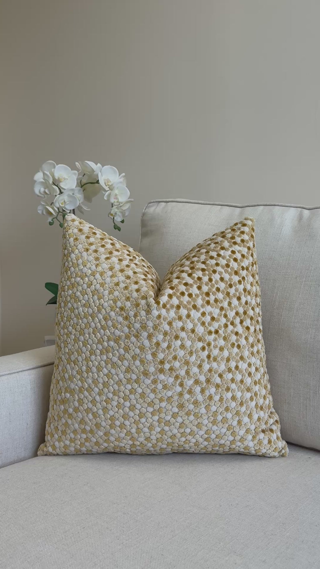 Warm gold velvet dots scatter across a soft neutral ground, creating a playful yet refined texture. The mix of golden tones adds a gentle glow, making this pillow an easy way to bring warmth and interest into any room. Its dimensional pattern layers beautifully with creams, linens, and other soft neutrals, or can stand alone as a sunny accent on a sofa or chair.