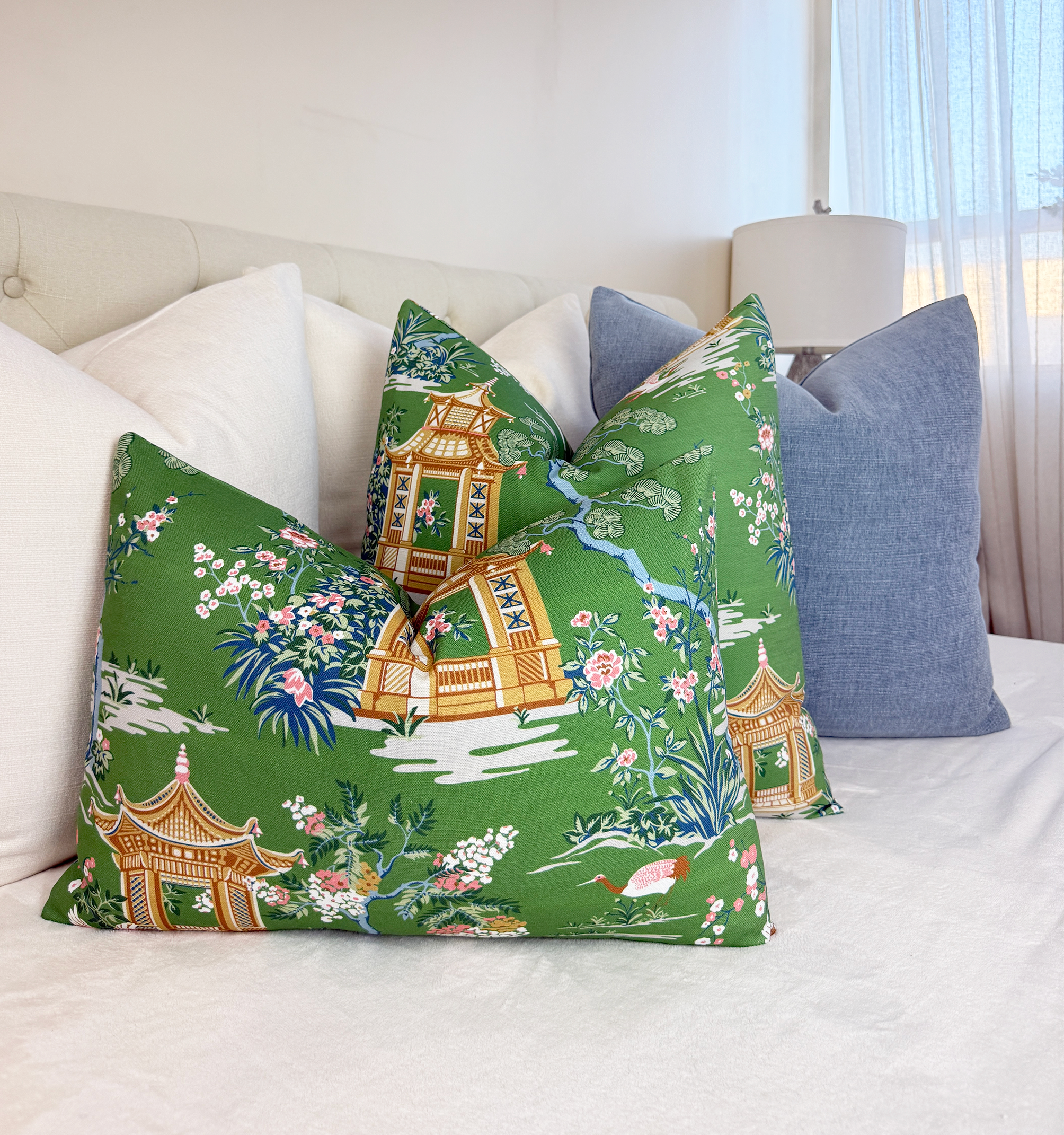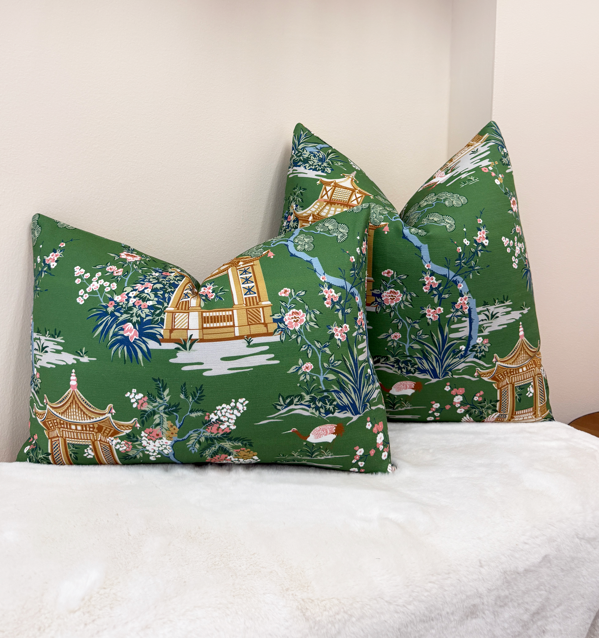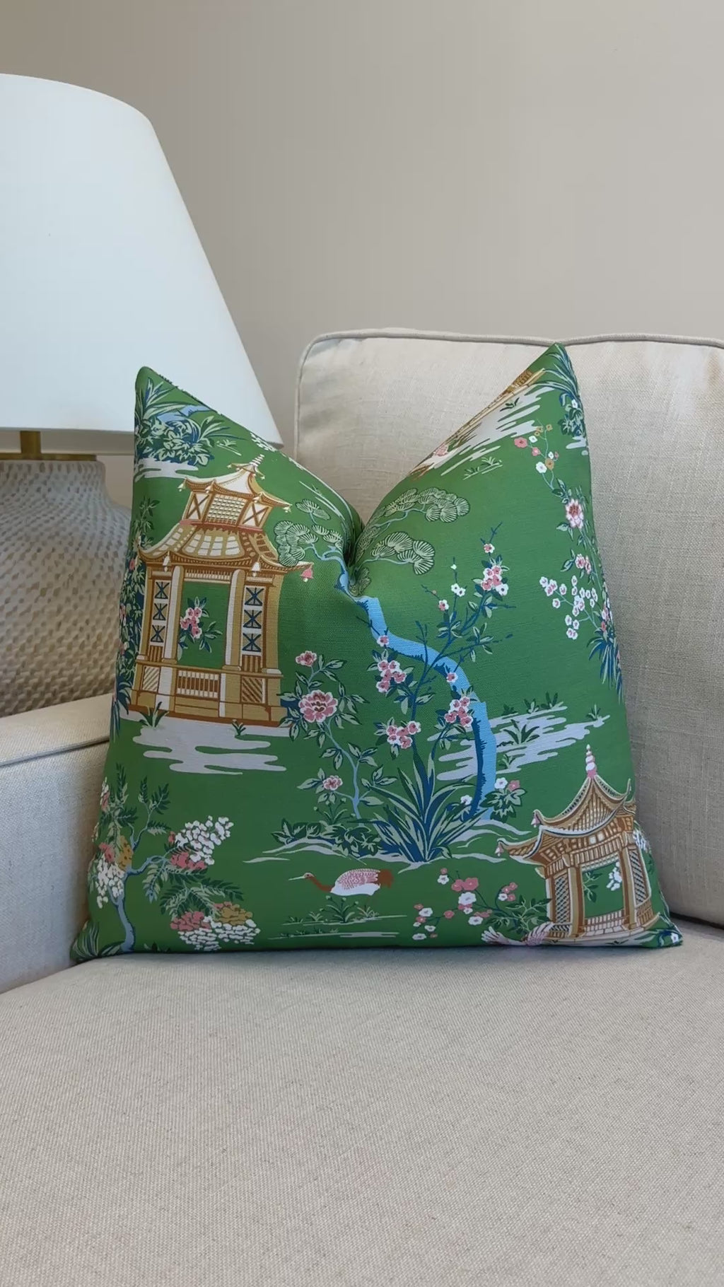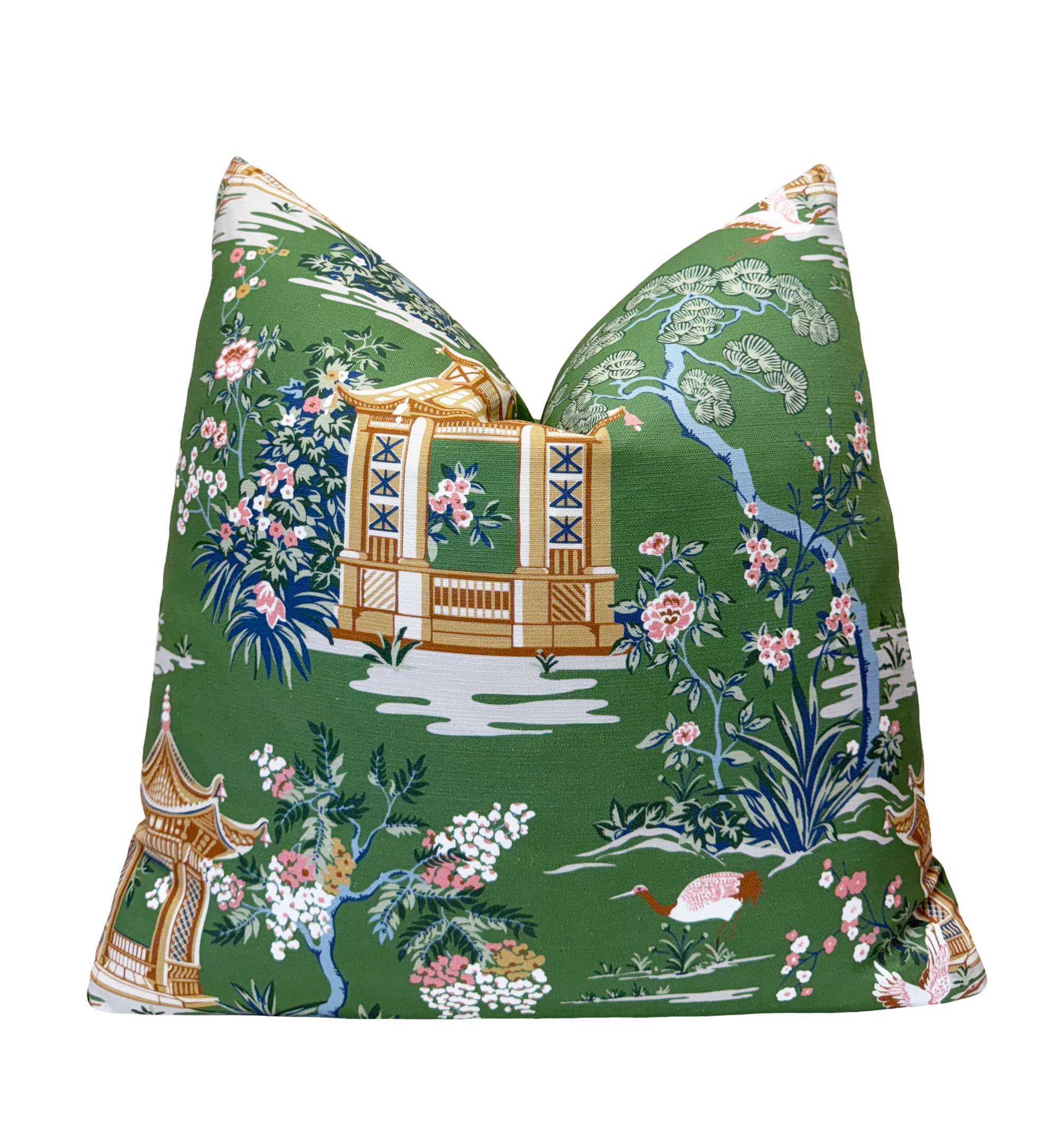 Bring a touch of timeless charm to your collection with this green chinoiserie pillow, featuring an elegant landscape of pagodas, flowering trees, and cranes in shades of gold, blush, and ivory. The detailed print draws the eye with its painterly depth and graceful composition—perfect for adding pattern and sophistication to any mix.