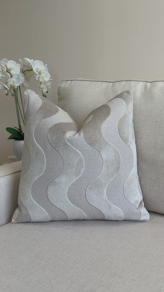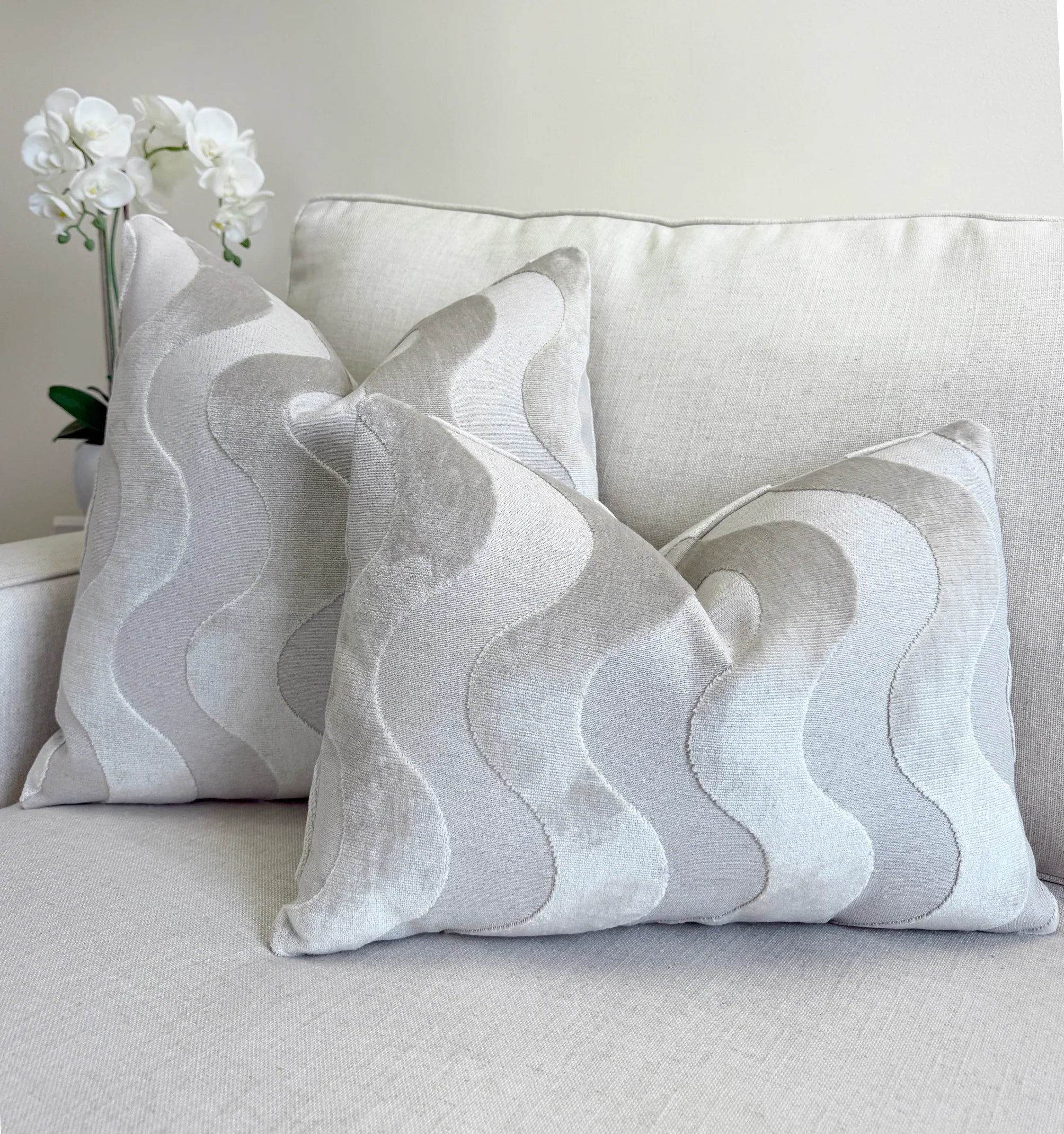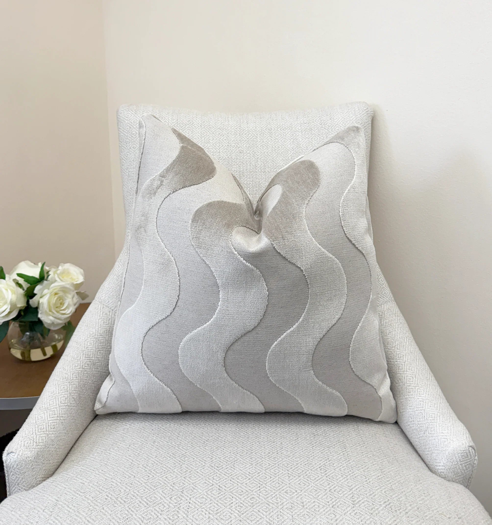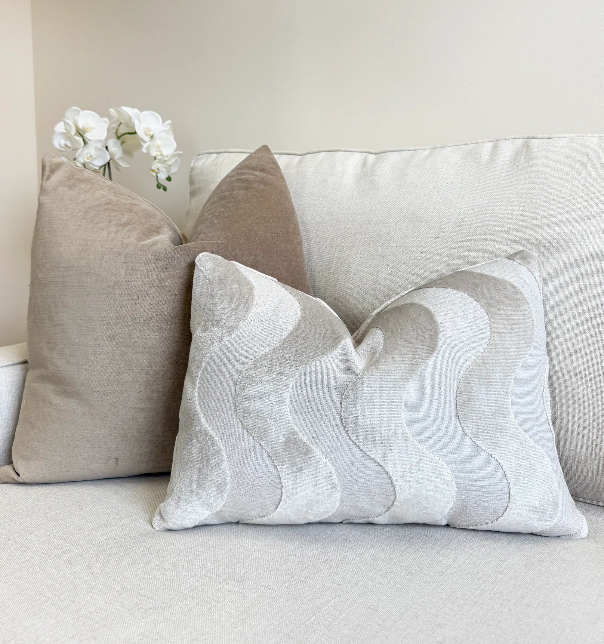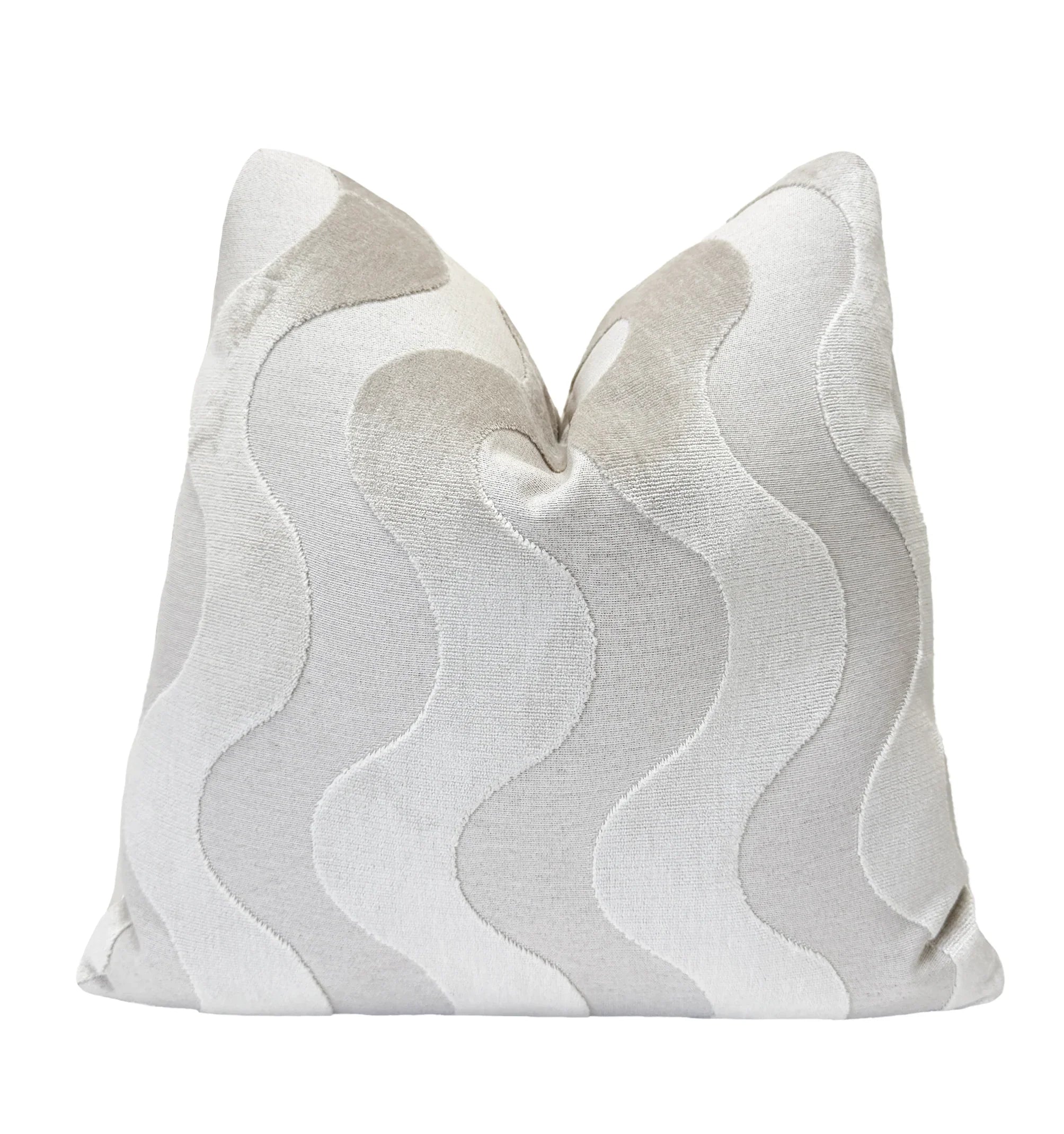 Soft, sculptural waves in a pale pearl tone give this pillow a serene, elevated look. The velvet’s gentle sheen brings dimension to the pattern, creating movement without overpowering a space. This warm, light neutral pairs effortlessly with creams, beiges, sands, and other soft naturals — a versatile shade that blends beautifully in any setting.