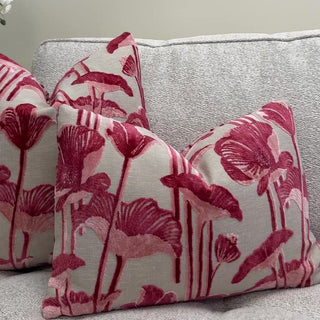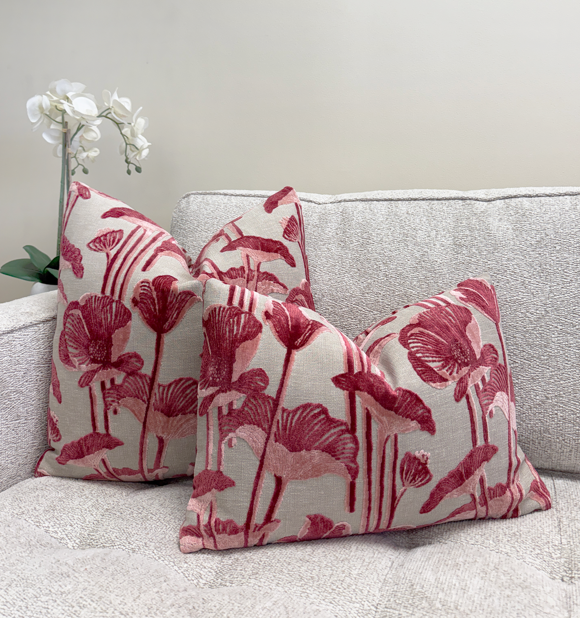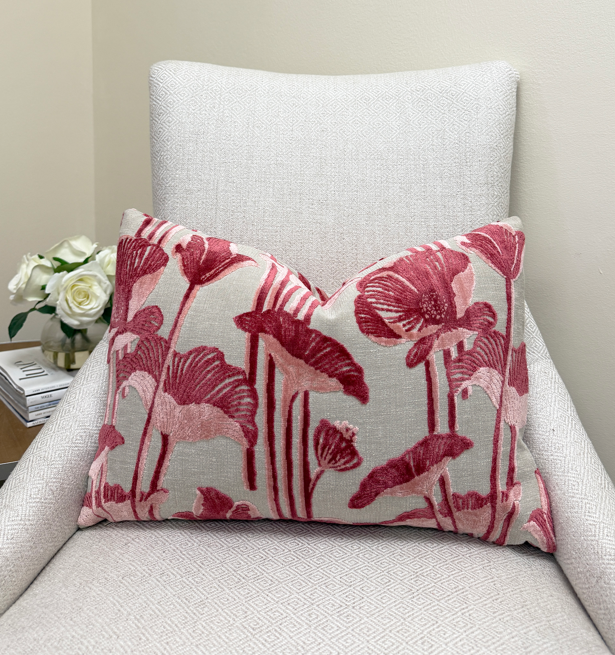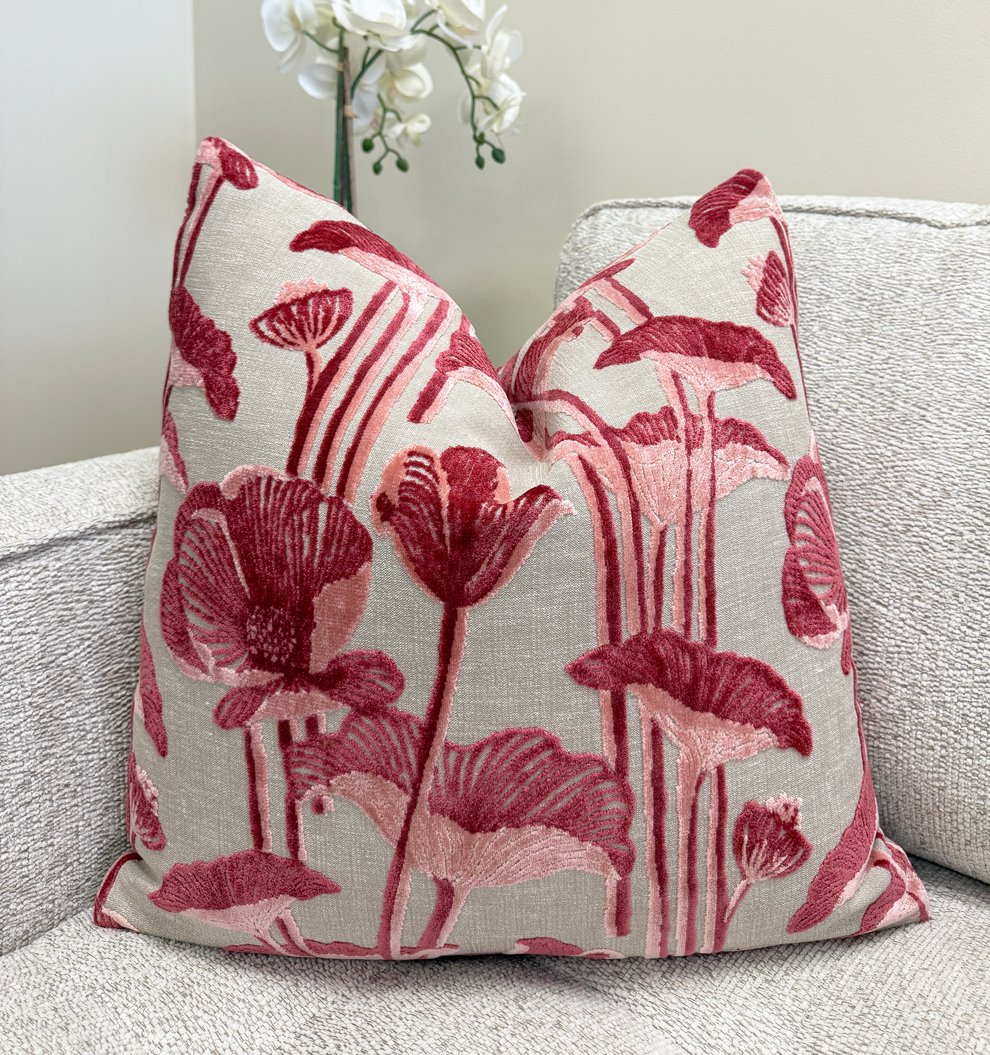 A field of rich maroon poppies comes to life in plush velvet against a soft neutral ground. The floral design adds depth and dimension through its raised texture, blending rich amber tones with subtle flamingo pink contrast. It's a bold yet elegant accent that works beautifully on its own or layered with solids.
