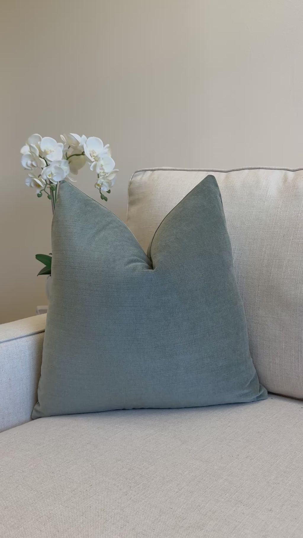 This eucalyptus velvet pillow brings a soft, calming presence to any space. The color sits somewhere between sage and muted green, with subtle undertones that shift beautifully in the light. Crafted in a smooth velvet with a gentle sheen, it adds depth and texture without feeling bold or overpowering. Easy to style with neutrals, warm woods, and layered patterns, this pillow cover works just as well on a sofa as it does styled on a bed or accent chair.