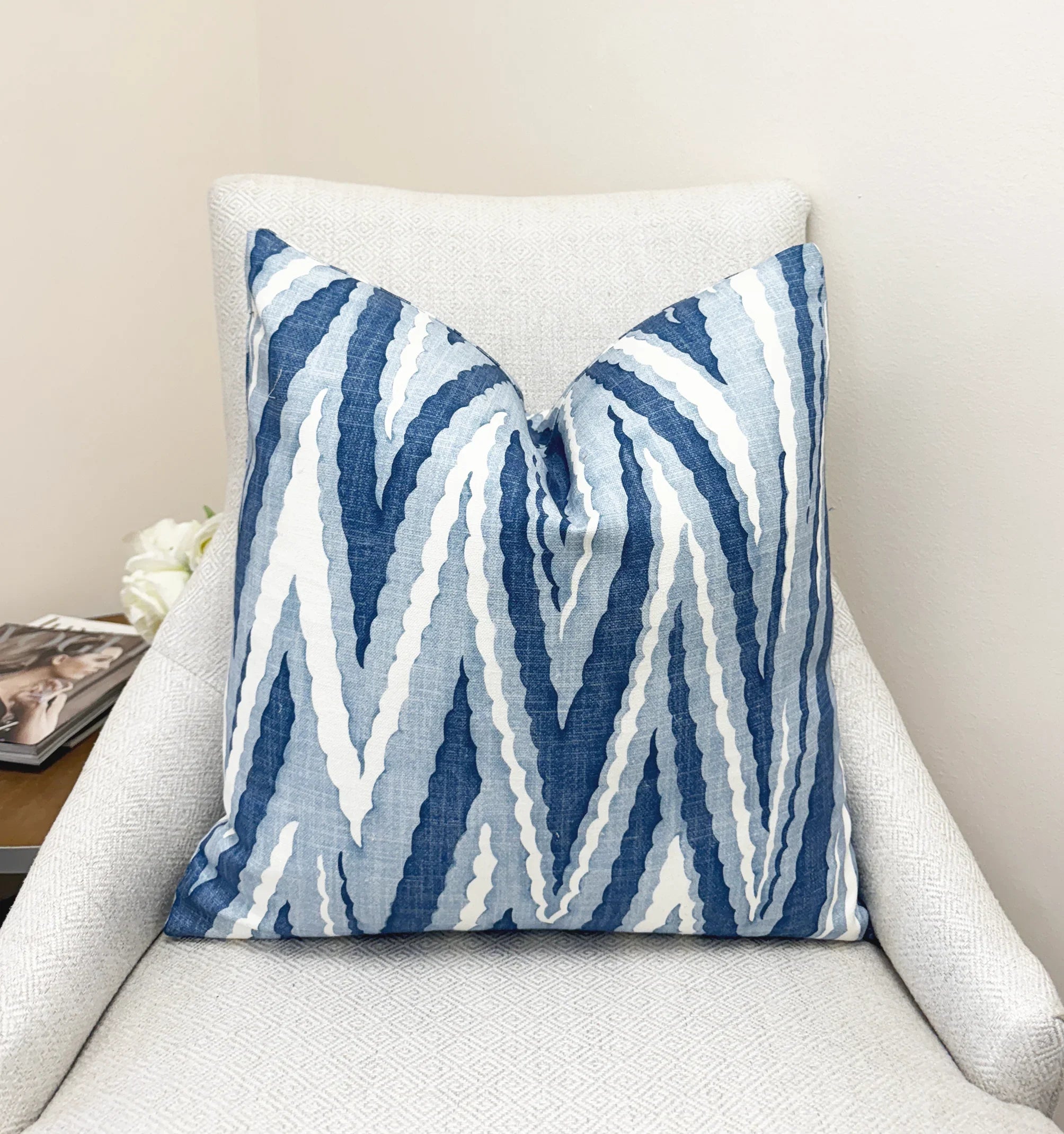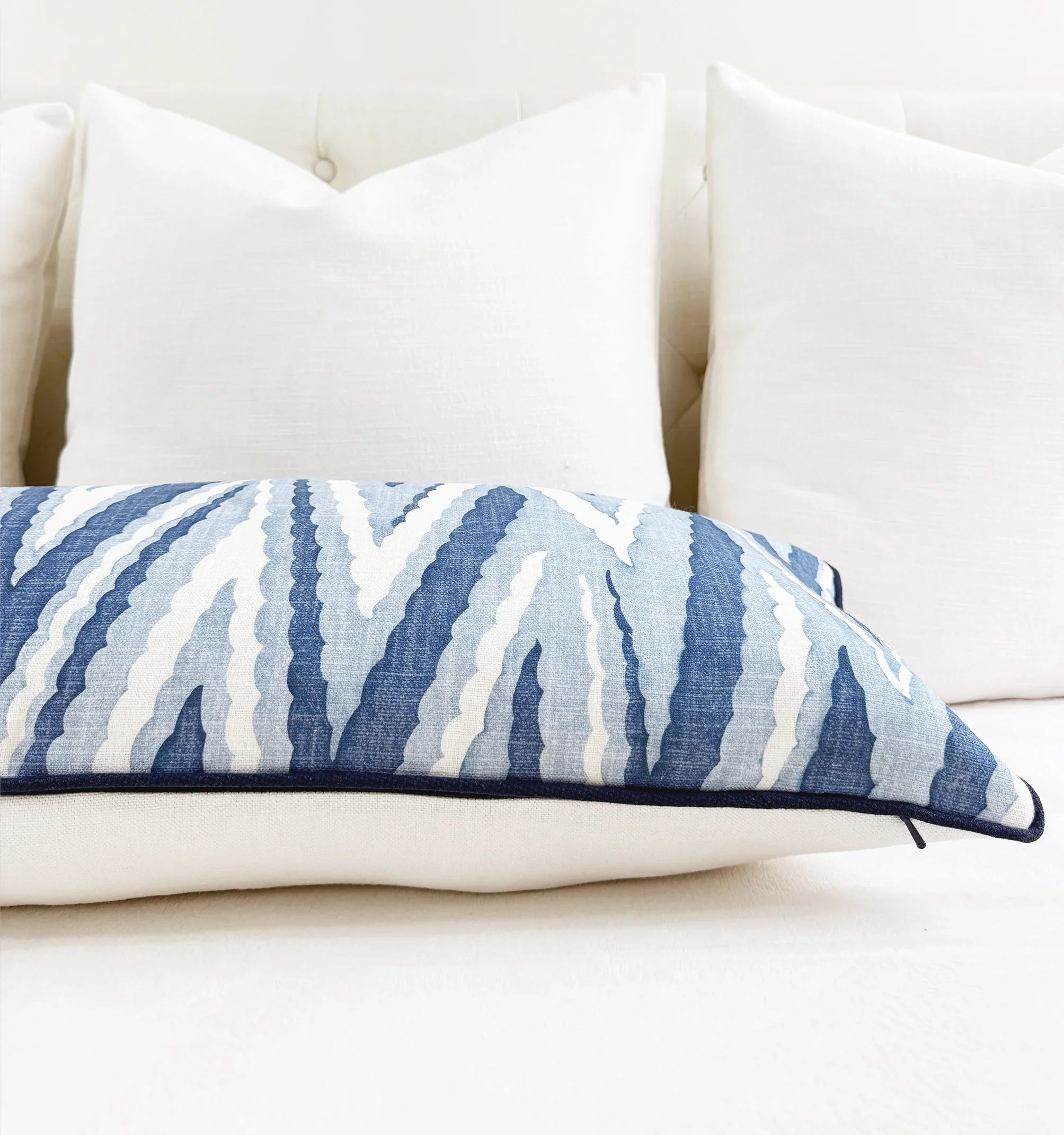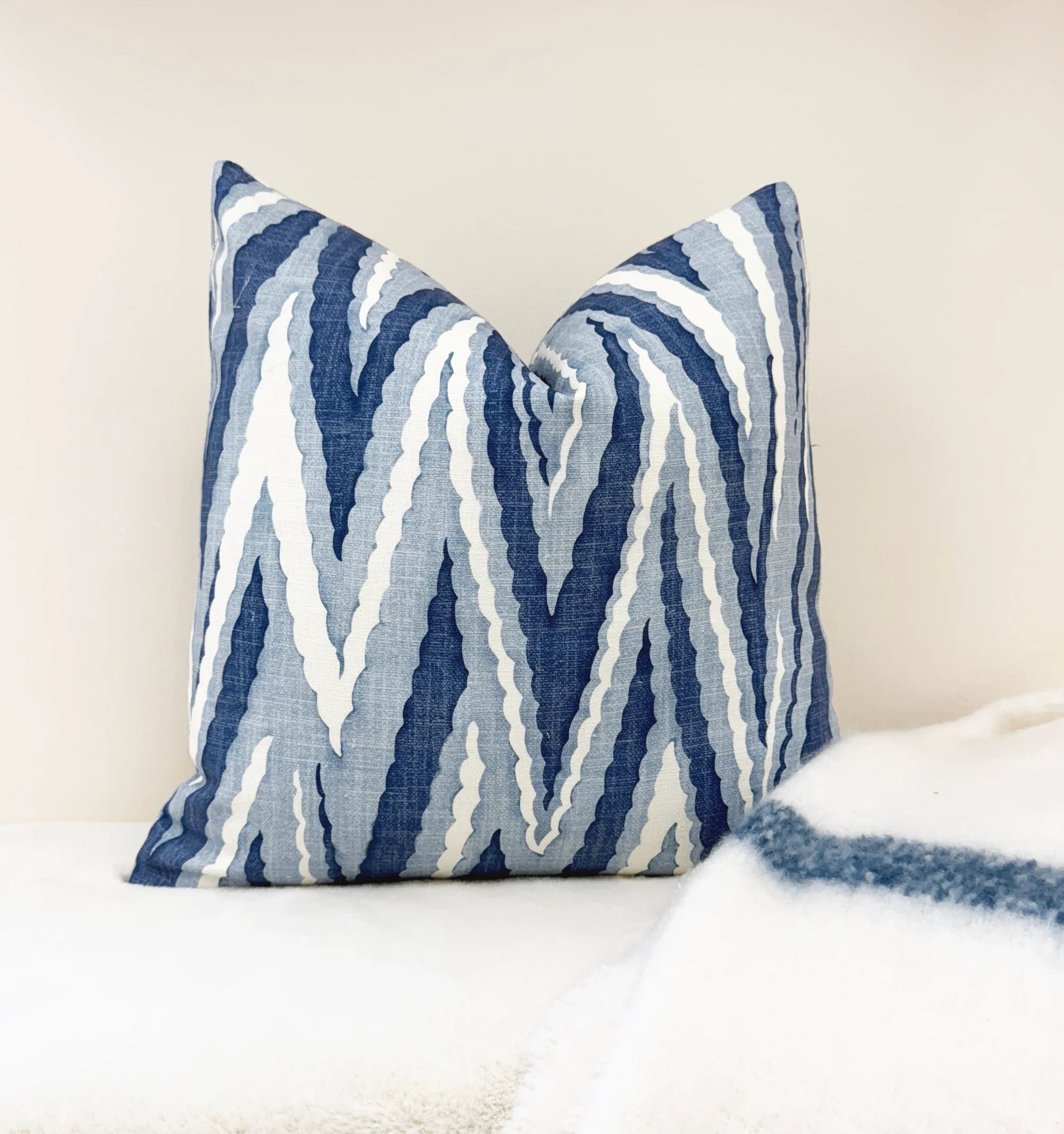 A bold, coastal-leaning statement, this pillow features a striking Thibaut designer linen with layered waves of indigo, chambray, and soft white. The zigzag watercolor pattern adds movement and depth while still feeling airy and refined. It’s a beautiful way to bring artful texture and a hit of blue into bedrooms, living rooms, or any space that could use a little lift.