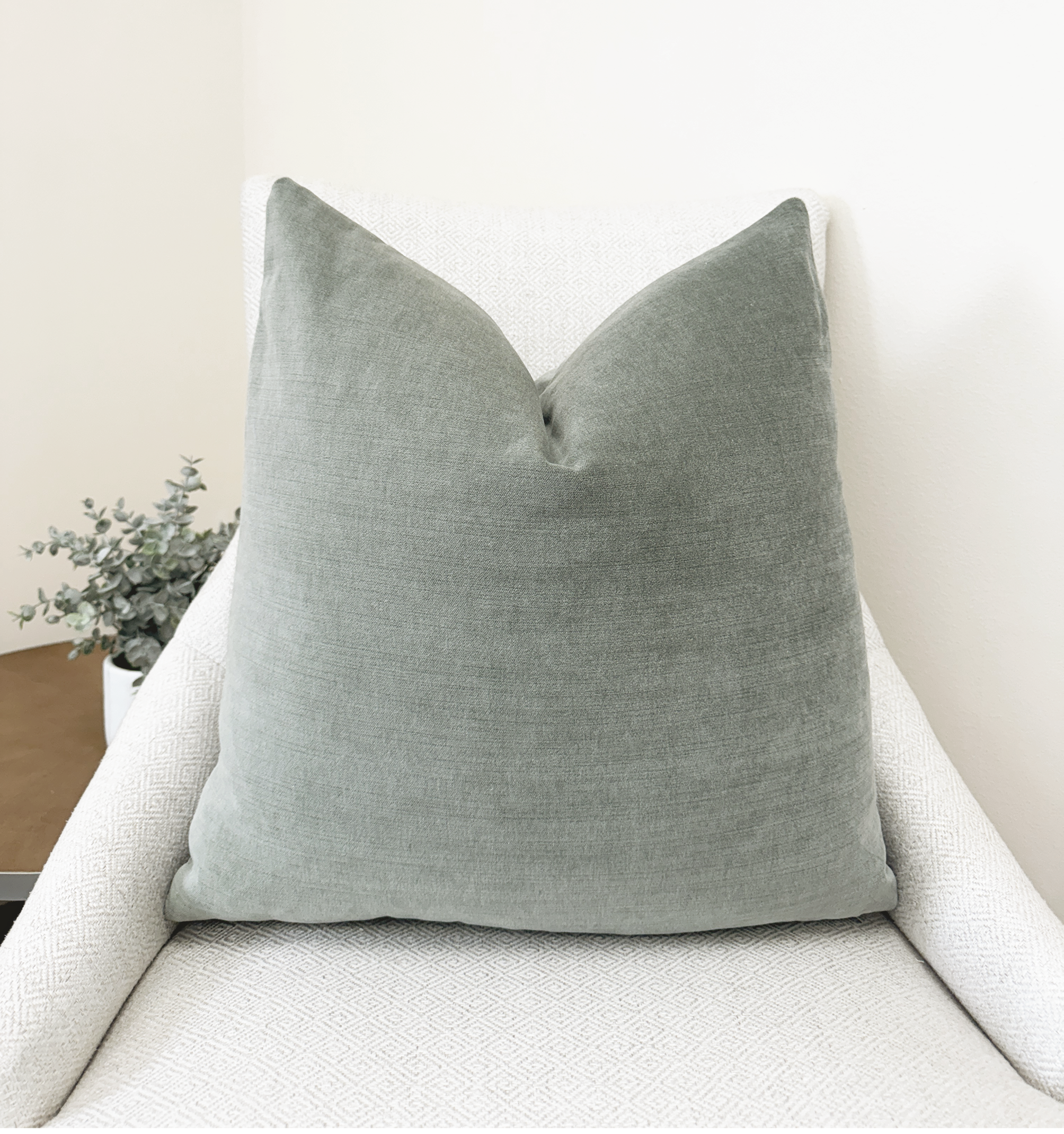 This eucalyptus velvet pillow brings a soft, calming presence to any space. The color sits somewhere between sage and muted green, with subtle undertones that shift beautifully in the light. Crafted in a smooth velvet with a gentle sheen, it adds depth and texture without feeling bold or overpowering. Easy to style with neutrals, warm woods, and layered patterns, this pillow cover works just as well on a sofa as it does styled on a bed or accent chair.
