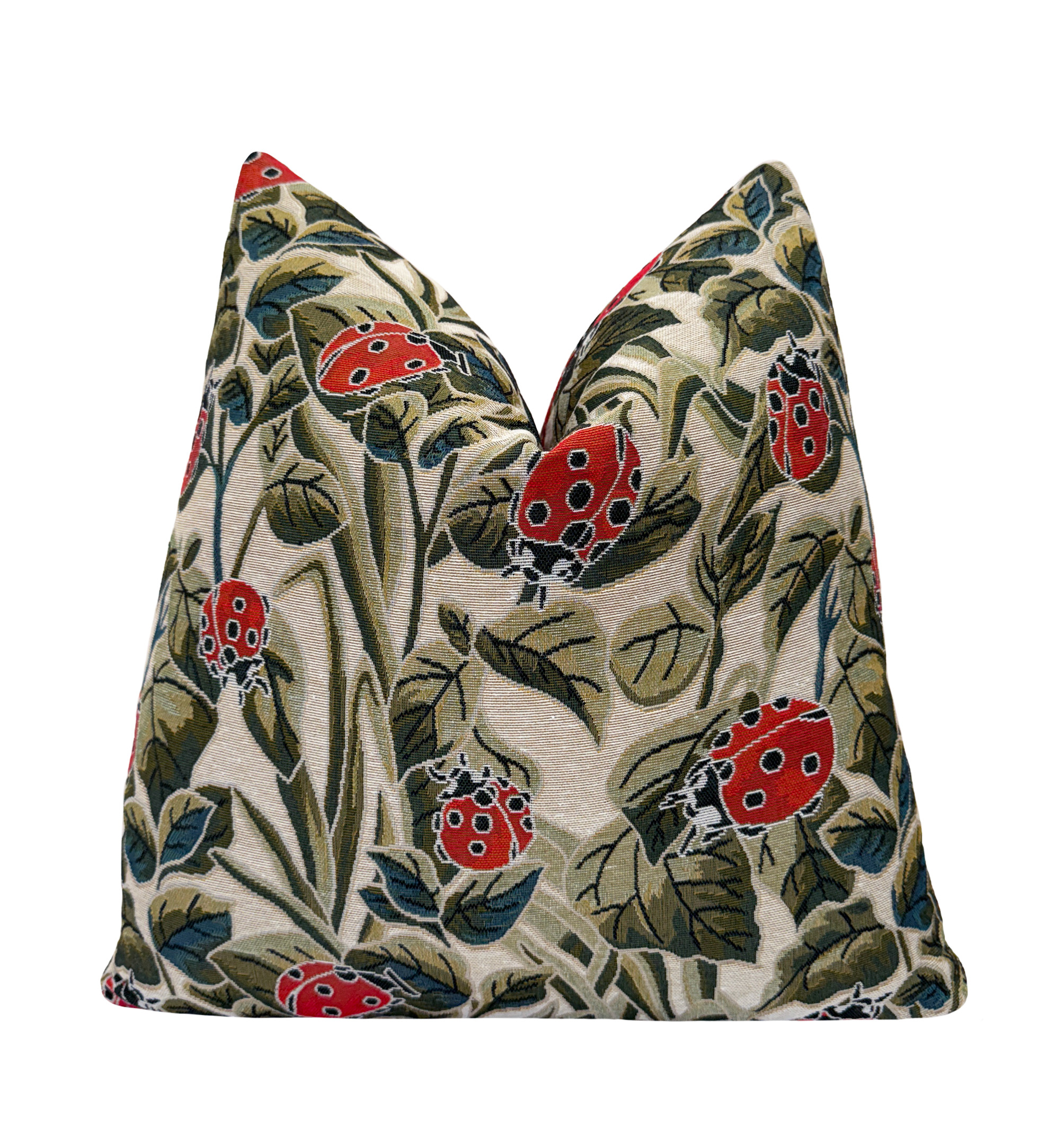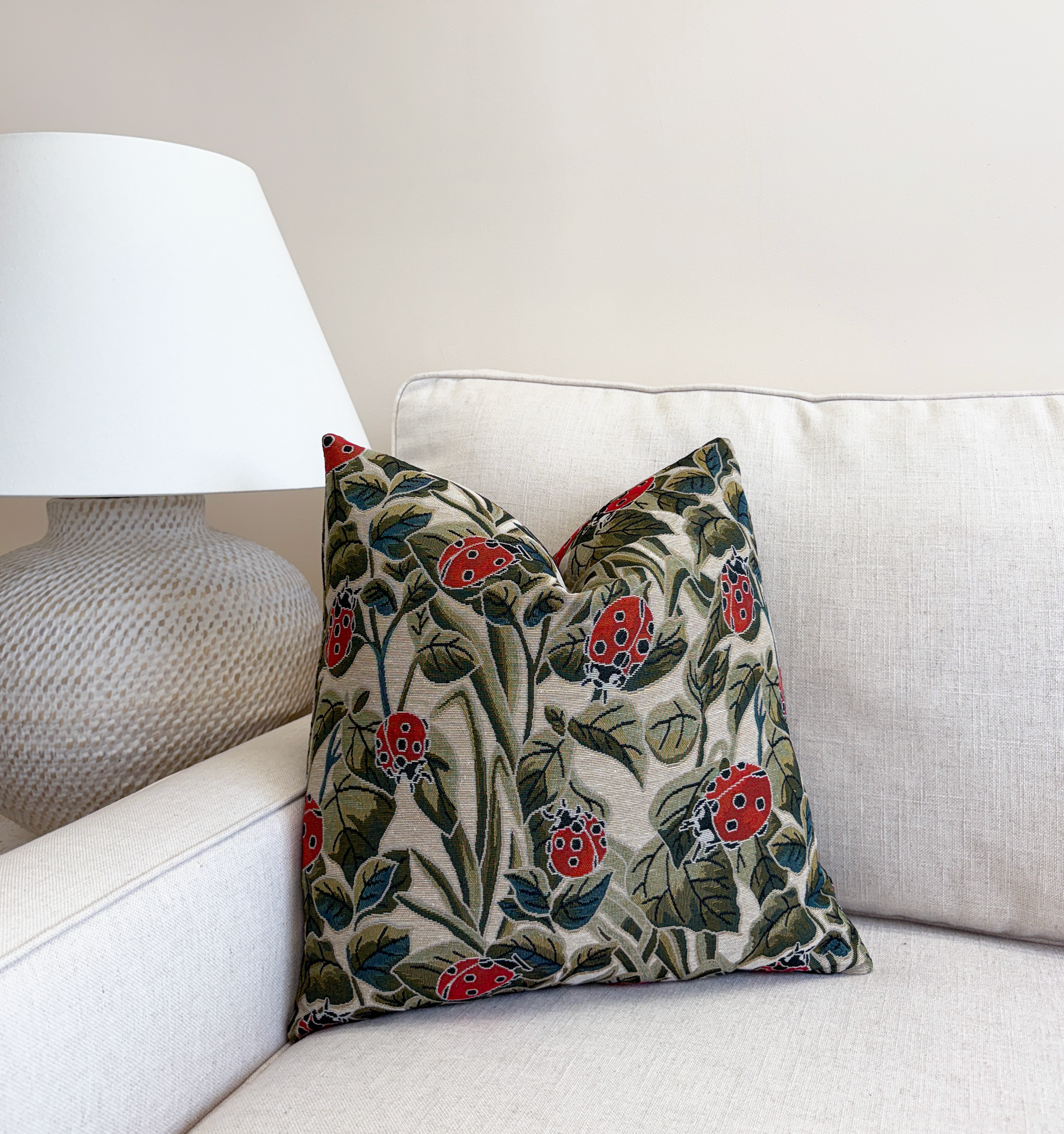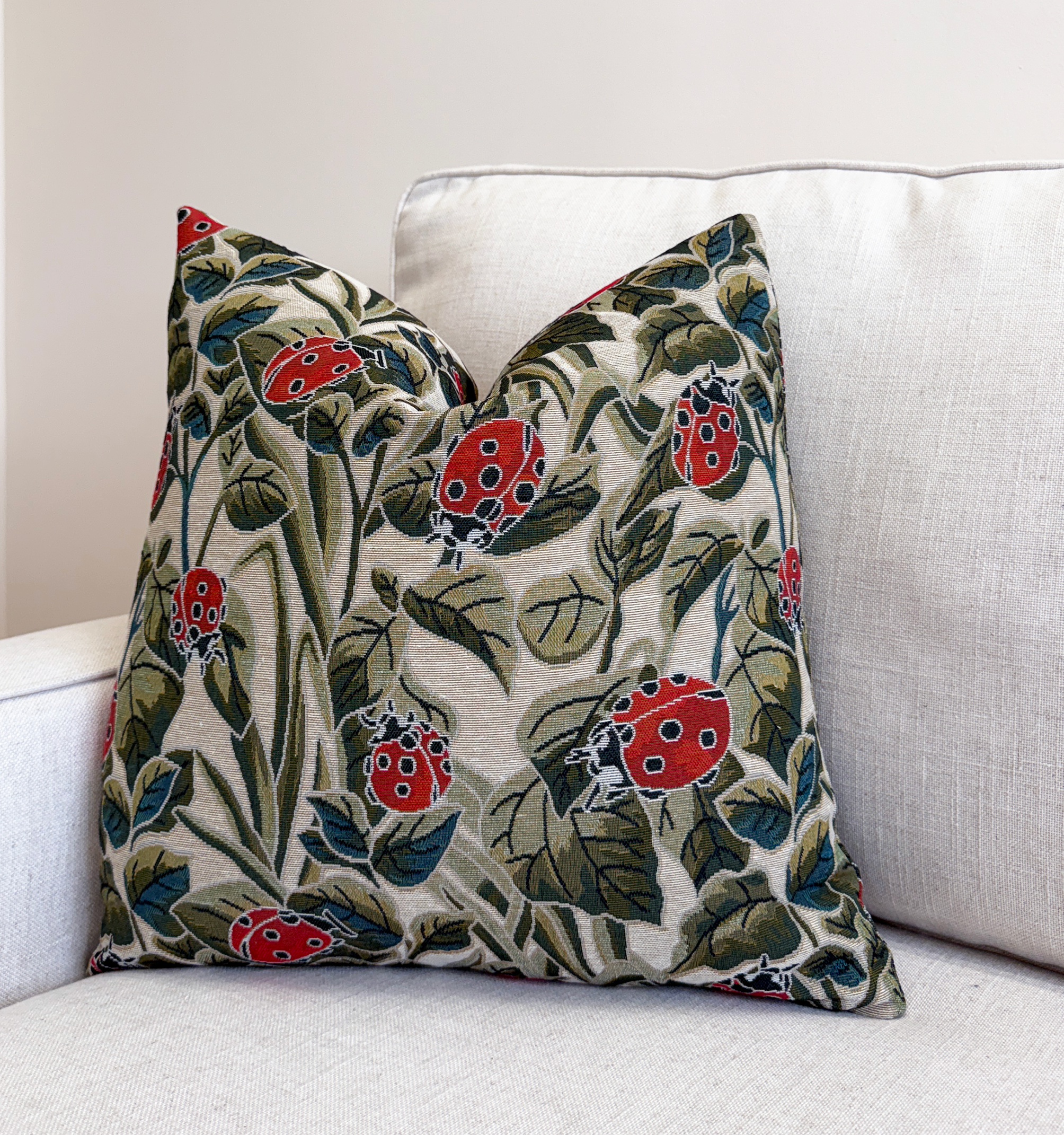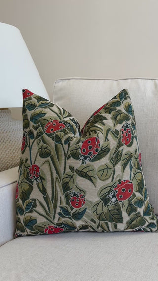 Bring a touch of whimsy and charm to your space with this nature-inspired design featuring vivid red ladybugs among lush green leaves. The textured fabric has a timeless, tapestry-like feel that blends beautifully with neutral tones and natural wood accents. Its earthy palette and playful motif make it an easy accent for layered, eclectic, or cottage-style interiors.