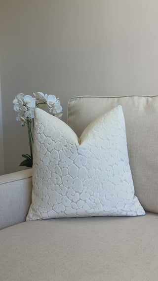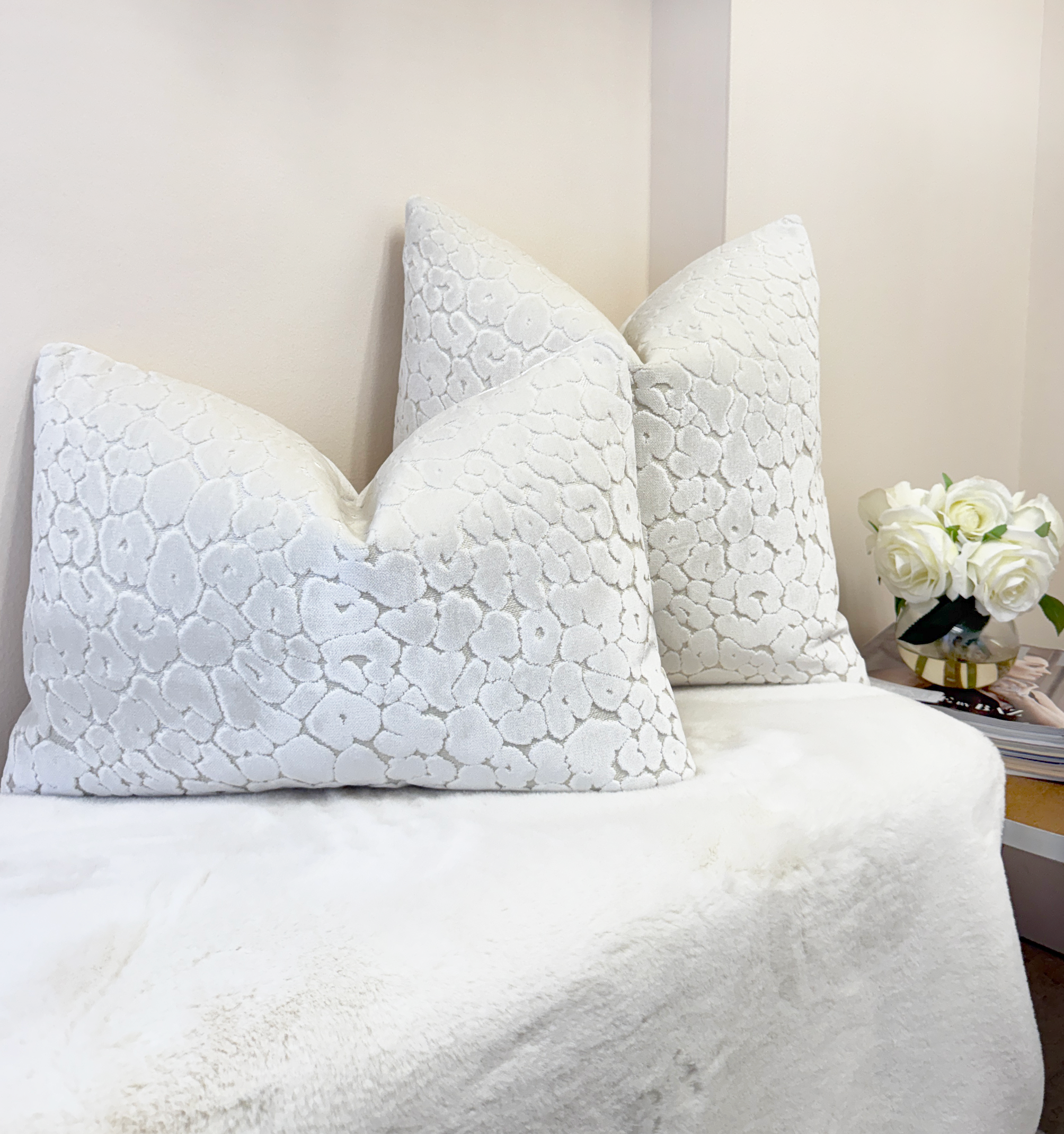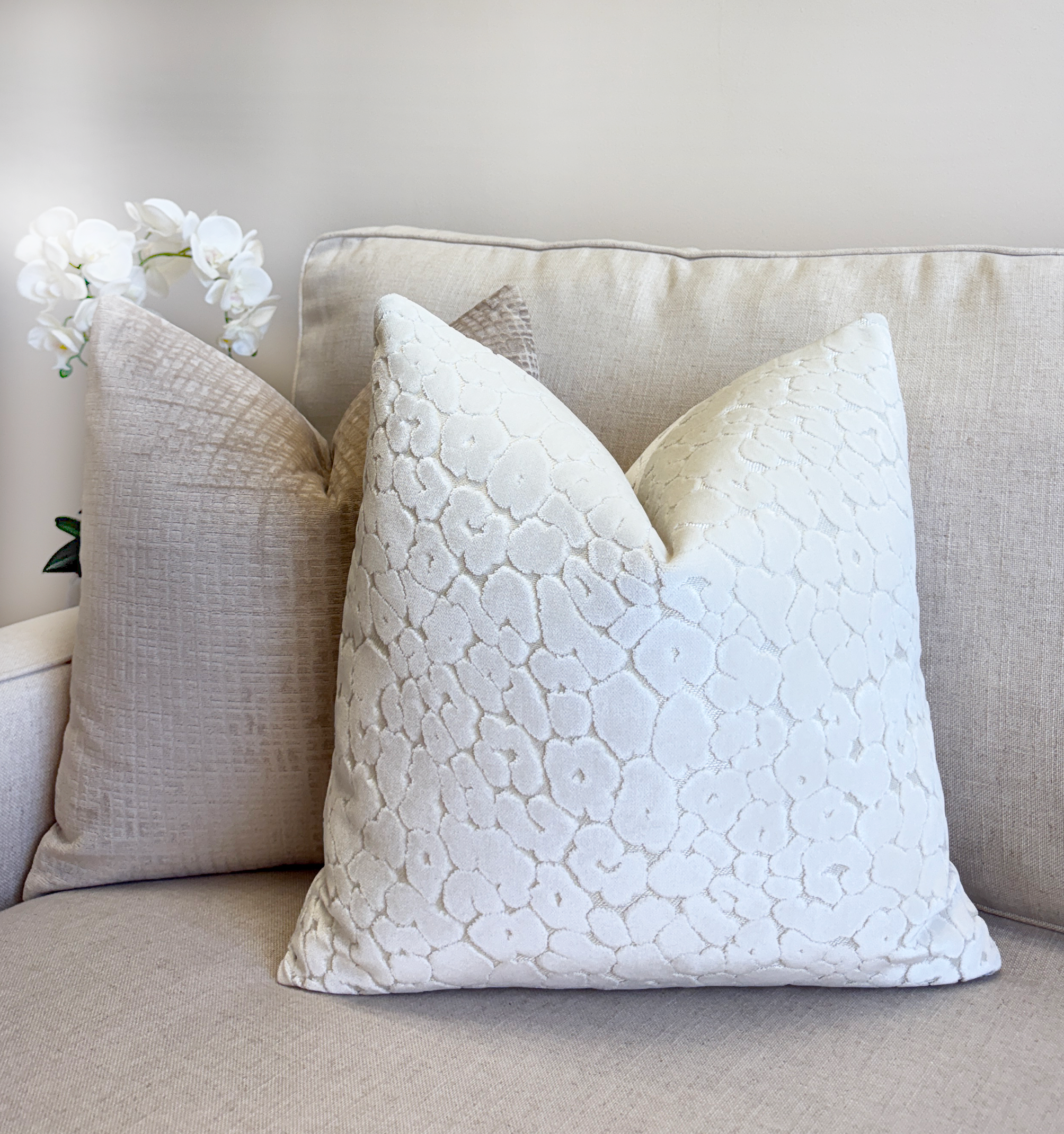 Understated and textural, the off white leopard pillow features a soft velvet pattern in tonal shades that add depth without overpowering a space. Its subtle sheen and neutral palette bring quiet sophistication to any setting.
