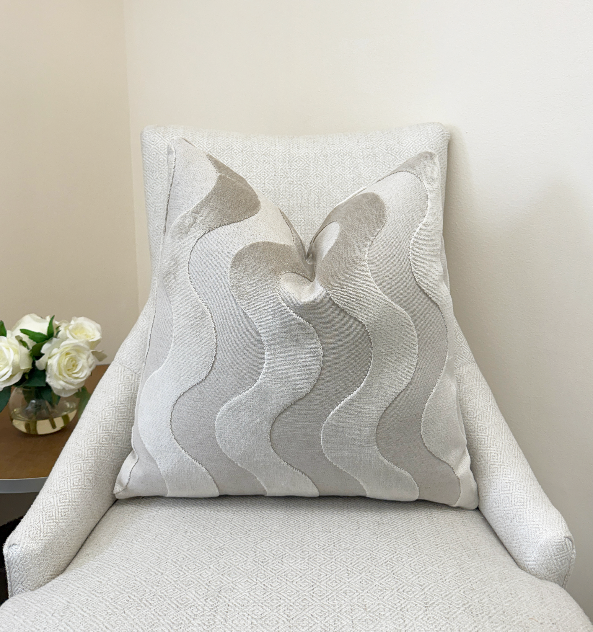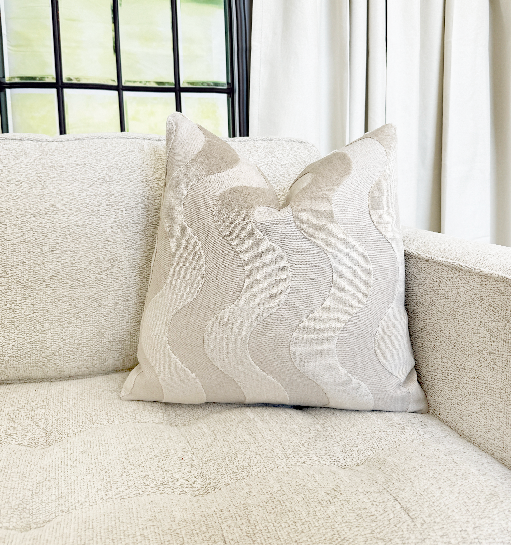Soft, sculptural waves in a pale sand tone give this pillow a serene, elevated look. The velvet’s gentle sheen brings dimension to the pattern, creating movement without overpowering a space. This warm, light neutral pairs effortlessly with creams, beiges, sands, and other soft naturals — a versatile shade that blends beautifully in any setting.